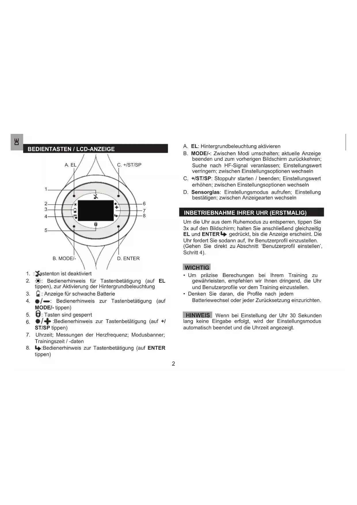 :Bedienerhinweis zur Tastenbetätigung (auf ENTER tippen) A. EL: Hintergrundbeleuchtung aktivieren B. MODE/-: Zwischen Modi umschalten; aktuelle Anzeige beenden und zum vorherigen Bildschirm zurückkehren; Suche nach HF-Signal veranlassen; Einstellungswert verringern; zwischen Einstellungsoptionen wechseln C. +/ST/SP: Stoppuhr starten / beenden; Einstellungswert erhöhen; zwischen Einstellungsoptionen wechseln D. Sensorglas: Einstellungsmodus aufrufen; Einstellung bestätigen; zwischen Anzeigearten wechseln INBETRIEBNAHME IHRER UHR (ERSTMALIG) Um die Uhr aus dem Ruhemodus zu entsperren, tippen Sie 3x auf den Bildschirm; halten Sie anschließend gleichzeitig EL und ENTER gedrückt, bis die Anzeige erscheint. Die Uhr fordert Sie sodann auf, Ihr Benutzerprol einzustellen. (Gehen Sie direkt zu Abschnitt ‘Benutzerprol einstellen’, Schritt 4). WICHTIG