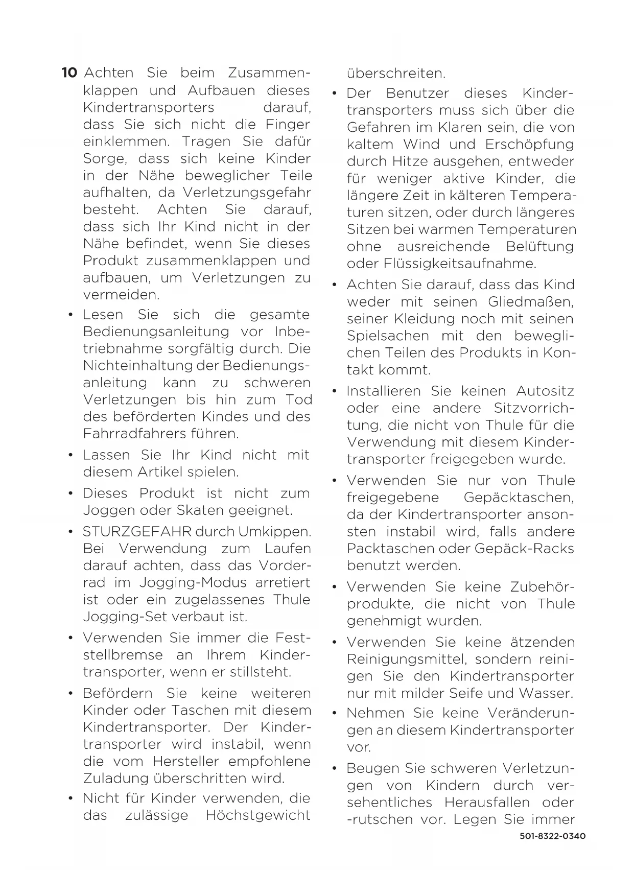 WARNUNG: 1 Die maximale Belastbarkeit der Ablage beträgt 4,5kg. Die maximale Belastbarkeit der hinteren Netztasche beträgt 1,4kg. Die maximale Belastbarkeit der seitlichen Netztasche beträgt 0,5 kg. 2 Stellen Sie vor der Verwendung sicher, dass alle Verriegelungen eingerastet sind. 3 Stellen Sie vor jeder Fahrt sicher, dass beide Räder sicher in der Achse des Transporters einge- rastet sind. 4 Lassen Sie das Kind nie unbeauf- sichtigt. 5 Die Feststellbremse muss immer angezogen sein, während Kinder ein- und aussteigen. 6 Der Sitz ist nicht für Kinder unter 6 Monaten geeignet. Für jüngere Kinder ist ein entsprechendes Thule Babyzubehör zu verwen- den. 7 Verwenden Sie stets das Rück- haltesystem. 8 Prüfen Sie vor Gebrauch, ob die Befestigungen des Kinderwa- gens, der Sitzeinheit oder des Autositzes richtig eingerastet sind. 9 Klickgeräusch muss hörbar sein, soweit dies in der Bedienungs- anleitung angegeben ist.501-8322-0340 10 Achten Sie beim Zusammen- klappen und Aufbauen dieses Kindertransporters darauf, dass Sie sich nicht die Finger einklemmen. Tragen Sie dafür Sorge, dass sich keine Kinder in der Nähe beweglicher Teile aufhalten, da Verletzungsgefahr besteht. Achten Sie darauf, dass sich Ihr Kind nicht in der Nähe befindet, wenn Sie dieses Produkt zusammenklappen und aufbauen, um Verletzungen zu vermeiden.