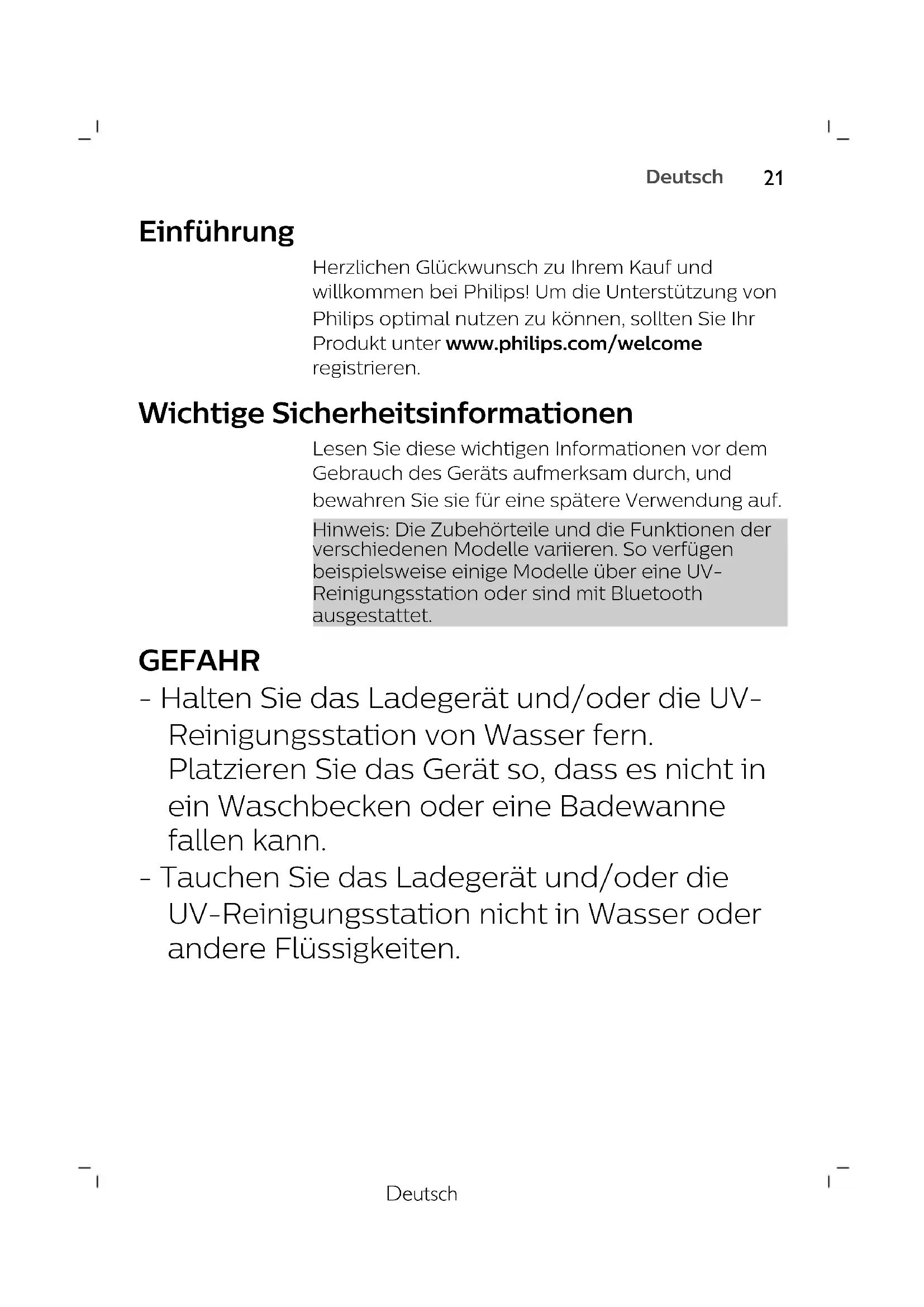 EnglishDeutsch Einführung Herzlichen Glückwunsch zu Ihrem Kauf und willkommen bei Philips! Um die Unterstützung von Philips optimal nutzen zu können, sollten Sie Ihr Produkt unter www.philips.com/welcome registrieren. Wichtige Sicherheitsinformationen Lesen Sie diese wichtigen Informationen vor dem Gebrauch des Geräts aufmerksam durch, und bewahren Sie sie für eine spätere Verwendung auf. Hinweis: Die Zubehörteile und die Funktionen der verschiedenen Modelle variieren. So verfügen beispielsweise einige Modelle über eine UV- Reinigungsstation oder sind mit Bluetooth ausgestattet. GEFAHR - Halten Sie das Ladegerät und/oder die UV- Reinigungsstation von Wasser fern. Platzieren Sie das Gerät so, dass es nicht in ein Waschbecken oder eine Badewanne fallen kann. - Tauchen Sie das Ladegerät und/oder die UV-Reinigungsstation nicht in Wasser oder andere Flüssigkeiten.