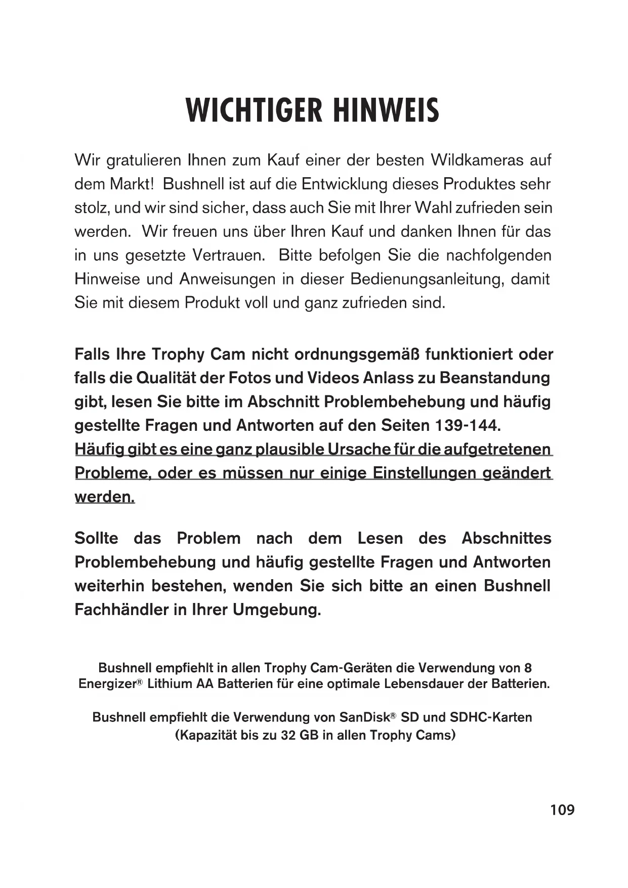 GEBRAUCHSANLEITUNG DEuTSCH109 WICHTIGEr HINWEIS Wir gratulieren Ihnen zum Kauf einer der besten Wildkameras auf dem Markt! Bushnell ist auf die Entwicklung dieses Produktes sehr stolz, und wir sind sicher, dass auch Sie mit Ihrer Wahl zufrieden sein werden. Wir freuen uns über Ihren Kauf und danken Ihnen für das in uns gesetzte Vertrauen. Bitte befolgen Sie die nachfolgenden Hinweise und Anweisungen in dieser Bedienungsanleitung, damit Sie mit diesem Produkt voll und ganz zufrieden sind. Falls Ihre Trophy Cam nicht ordnungsgemäß funktioniert oder falls die Qualität der Fotos und Videos Anlass zu Beanstandung gibt, lesen Sie bitte im Abschnitt Problembehebung und häufig gestellte Fragen und Antworten auf den Seiten 139-144. Häufig gibt es eine ganz plausible Ursache für die aufgetretenen Probleme, oder es müssen nur einige Einstellungen geändert werden. Sollte das Problem nach dem Lesen des Abschnittes Problembehebung und häufig gestellte Fragen und Antworten weiterhin bestehen, wenden Sie sich bitte an einen Bushnell Fachhändler in Ihrer Umgebung. Bushnell empfiehlt in allen Trophy Cam-Geräten die Verwendung von 8 Energizer