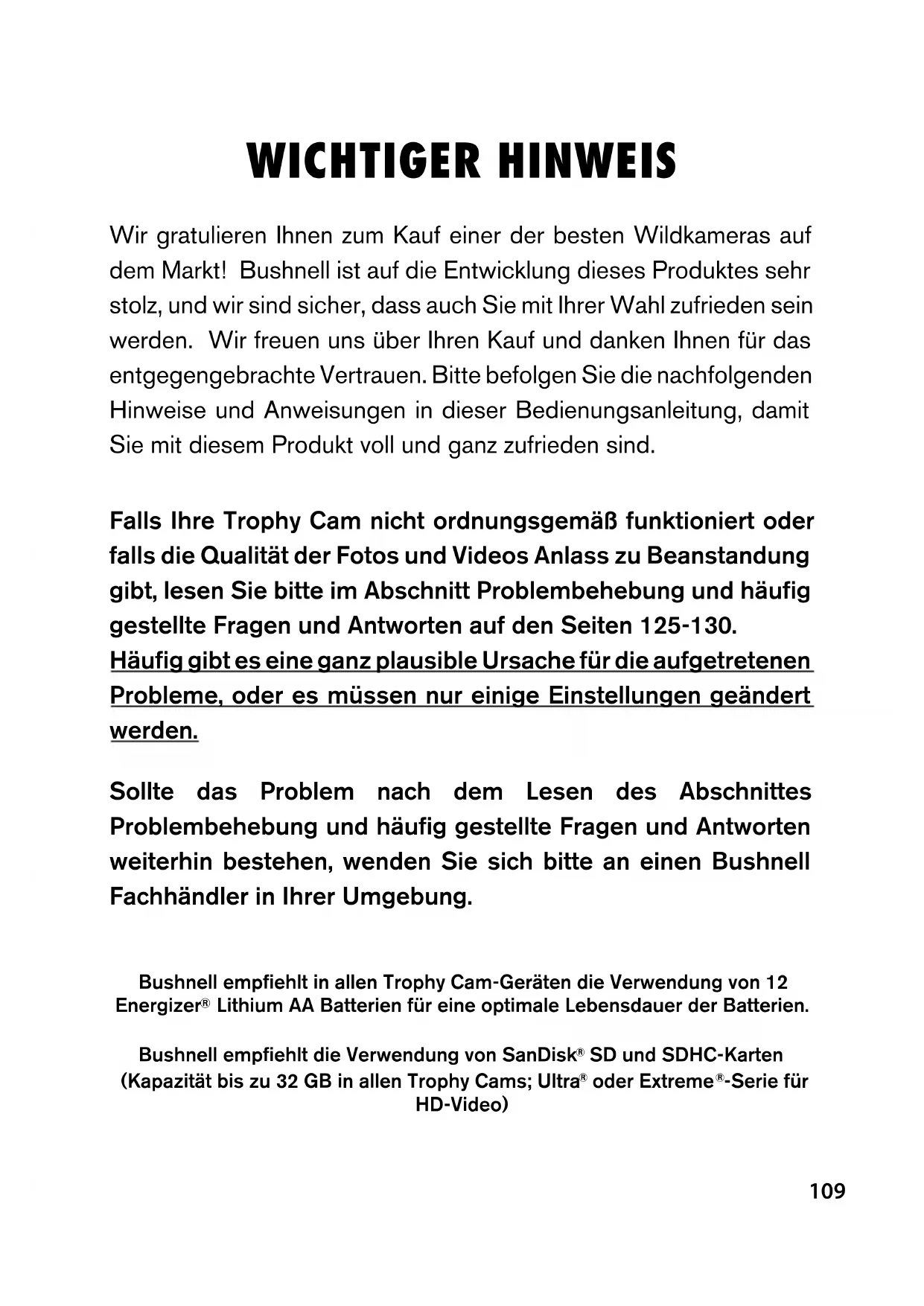 GEBRAUCHSANLEITUNG Modellnummern: 119466 / 119467 Lit# 98-2019 / 4-11 DEuTSCH VIDEO109 WICHTIGER HINWEIS Wir gratulieren Ihnen zum Kauf einer der besten Wildkameras auf dem Markt! Bushnell ist auf die Entwicklung dieses Produktes sehr stolz, und wir sind sicher, dass auch Sie mit Ihrer Wahl zufrieden sein werden. Wir freuen uns über Ihren Kauf und danken Ihnen für das entgegengebrachte Vertrauen. Bitte befolgen Sie die nachfolgenden Hinweise und Anweisungen in dieser Bedienungsanleitung, damit Sie mit diesem Produkt voll und ganz zufrieden sind. Falls Ihre Trophy Cam nicht ordnungsgemäß funktioniert oder falls die Qualität der Fotos und Videos Anlass zu Beanstandung gibt, lesen Sie bitte im Abschnitt Problembehebung und häufig gestellte Fragen und Antworten auf den Seiten 125-130. Häufig gibt es eine ganz plausible Ursache für die aufgetretenen Probleme, oder es müssen nur einige Einstellungen geändert werden. Sollte das Problem nach dem Lesen des Abschnittes Problembehebung und häufig gestellte Fragen und Antworten weiterhin bestehen, wenden Sie sich bitte an einen Bushnell Fachhändler in Ihrer Umgebung. Bushnell empfiehlt in allen Trophy Cam-Geräten die Verwendung von 12 Energizer