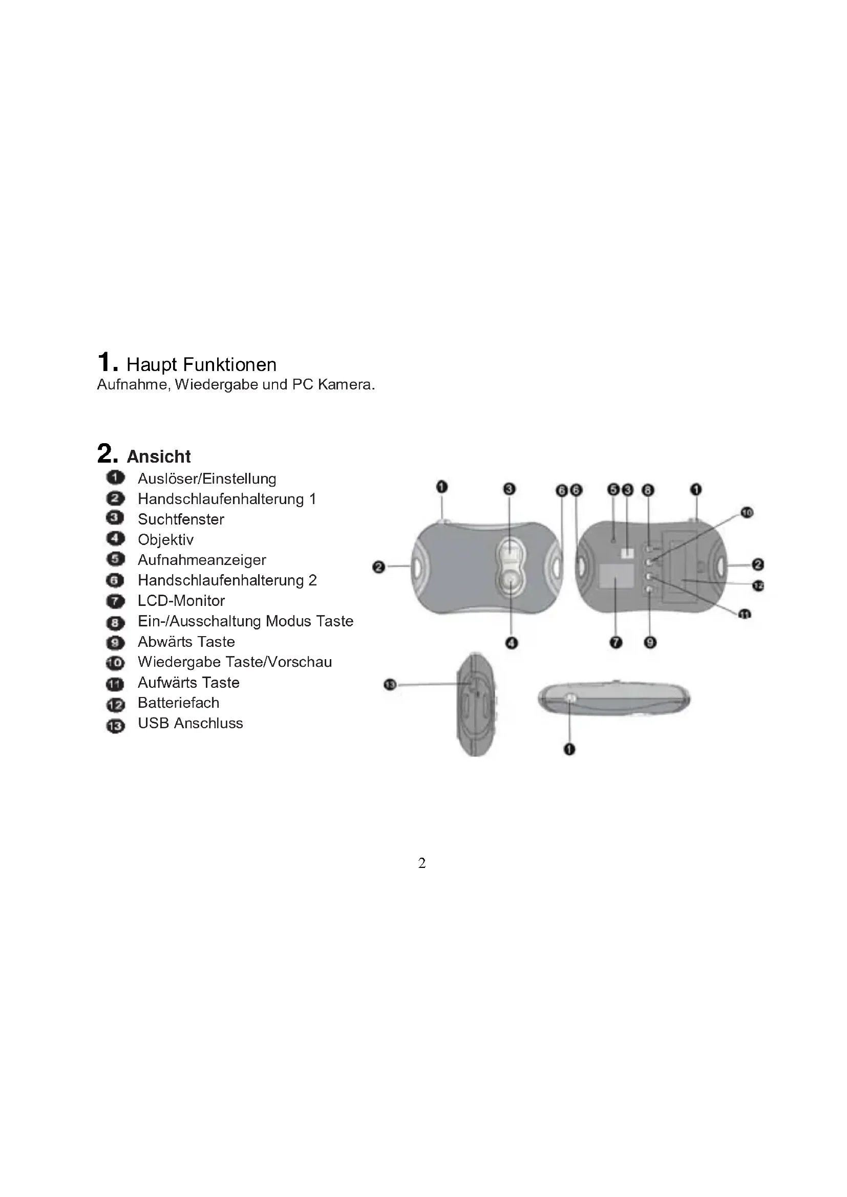 Auslöser/Einstellung Handschlaufenhalterung 1 Suchtfenster Objektiv Aufnahmeanzeiger Handschlaufenhalterung 2 LCD-Monitor Ein-/Ausschaltung Modus Taste Abwärts Taste Wiedergabe Taste/Vorschau Aufwärts Taste Batteriefach USB Anschluss