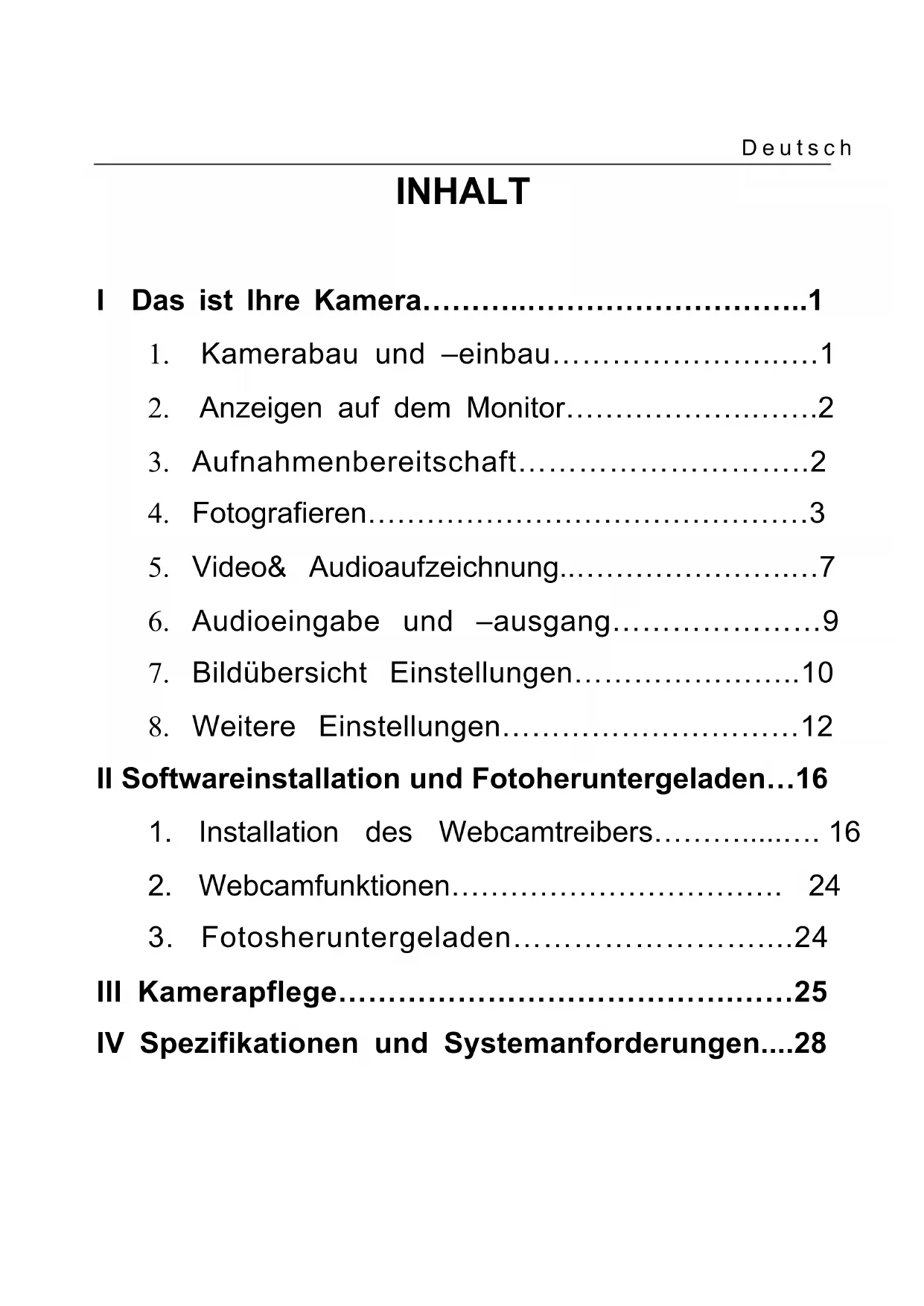 III Kamerapflege………………………………….……25 IV Spezifikationen und Systemanforderungen....28Deutsch