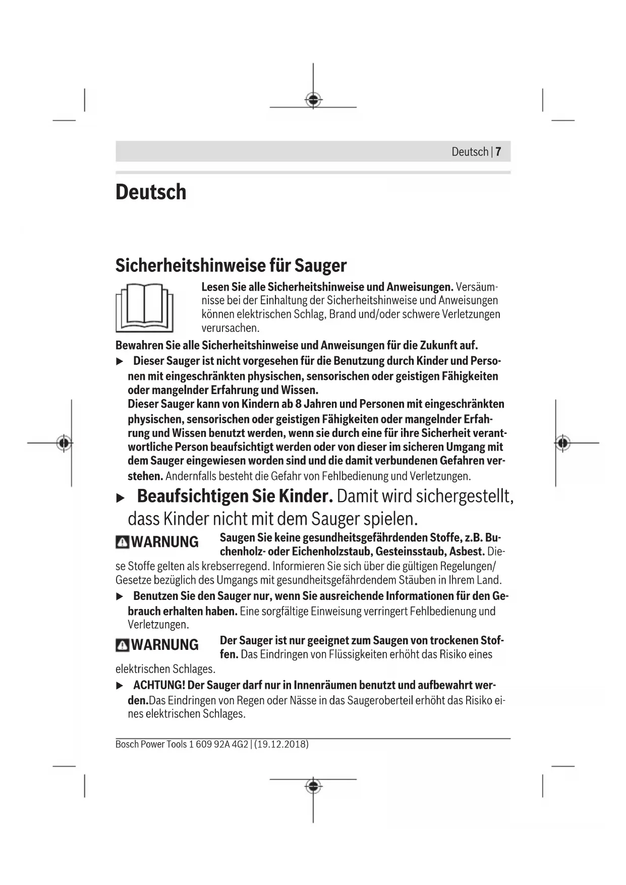(14) (16) (15) (15) (16) (15) (7) (14) 1 609 92A 4G2 | (19.12.2018) Bosch Power ToolsDeutsch | 7 Deutsch Sicherheitshinweise für Sauger Lesen Sie alle Sicherheitshinweise und Anweisungen. Versäum- nisse bei der Einhaltung der Sicherheitshinweise und Anweisungen können elektrischen Schlag, Brand und/oder schwere Verletzungen verursachen. Bewahren Sie alle Sicherheitshinweise und Anweisungen für die Zukunft auf. u Dieser Sauger ist nicht vorgesehen für die Benutzung durch Kinder und Perso- nen mit eingeschränkten physischen, sensorischen oder geistigen Fähigkeiten oder mangelnder Erfahrung und Wissen. Dieser Sauger kann von Kindern ab 8 Jahren und Personen mit eingeschränkten physischen, sensorischen oder geistigen Fähigkeiten oder mangelnder Erfah- rung und Wissen benutzt werden, wenn sie durch eine für ihre Sicherheit verant- wortliche Person beaufsichtigt werden oder von dieser im sicheren Umgang mit dem Sauger eingewiesen worden sind und die damit verbundenen Gefahren ver- stehen. Andernfalls besteht die Gefahr von Fehlbedienung und Verletzungen. u Beaufsichtigen Sie Kinder. Damit wird sichergestellt, dass Kinder nicht mit dem Sauger spielen. WARNUNG Saugen Sie keine gesundheitsgefährdenden Stoffe, z.B. Bu- chenholz- oder Eichenholzstaub, Gesteinsstaub, Asbest. Die- se Stoffe gelten als krebserregend. Informieren Sie sich über die gültigen Regelungen/ Gesetze bezüglich des Umgangs mit gesundheitsgefährdendem Stäuben in Ihrem Land. u Benutzen Sie den Sauger nur, wenn Sie ausreichende Informationen für den Ge- brauch erhalten haben. Eine sorgfältige Einweisung verringert Fehlbedienung und Verletzungen. WARNUNG Der Sauger ist nur geeignet zum Saugen von trockenen Stof- fen. Das Eindringen von Flüssigkeiten erhöht das Risiko eines elektrischen Schlages. u ACHTUNG! Der Sauger darf nur in Innenräumen benutzt und aufbewahrt wer- den.Das Eindringen von Regen oder Nässe in das Saugeroberteil erhöht das Risiko ei- nes elektrischen Schlages. Bosch Power Tools 1 609 92A 4G2 | (19.12.2018)8 | Deutsch u Sorgen Sie für gute Belüftung am Arbeitsplatz. u Lassen Sie den Sauger nur von qualifiziertem Fachpersonal mit Original-Ersatz- teilen reparieren. Damit wird sichergestellt, dass die Sicherheit des Saugers erhal- ten bleibt. u Prüfen Sie vor der Inbetriebnahme den einwandfreien Zustand des Saug- schlauchs. Lassen Sie dabei den Saugschlauch am Sauger montiert, damit nicht unbeabsichtigt Staub austritt. Sie können sonst Staub einatmen. u Reinigen Sie den Sauger nicht mit direkt gerichtetem Wasserstrahl. Das Eindrin- gen von Wasser in das Saugeroberteil erhöht das Risiko eines elektrischen Schlages. u Bei Beschädigung und unsachgemäßem Gebrauch des Akkus können Dämpfe austreten. Der Akku kann brennen oder explodieren. Führen Sie Frischluft zu und suchen Sie bei Beschwerden einen Arzt auf. Die Dämpfe können die Atemwege rei- zen. u Bei falscher Anwendung oder beschädigtem Akku kann brennbare Flüssigkeit aus dem Akku austreten. Vermeiden Sie den Kontakt damit. Bei zufälligem Kon- takt mit Wasser abspülen. Wenn die Flüssigkeit in die Augen kommt, nehmen Sie zusätzlich ärztliche Hilfe in Anspruch. Austretende Akkuflüssigkeit kann zu Hautrei- zungen oder Verbrennungen führen. u Durch spitze Gegenstände wie z. B. Nagel oder Schraubenzieher oder durch äu- ßere Krafteinwirkung kann der Akku beschädigt werden. Es kann zu einem inter- nen Kurzschluss kommen und der Akku brennen, rauchen, explodieren oder überhit- zen. u Halten Sie den nicht benutzten Akku fern von Büroklammern, Münzen, Schlüs- seln, Nägeln, Schrauben oder anderen kleinen Metallgegenständen, die eine Überbrückung der Kontakte verursachen könnten. Ein Kurzschluss zwischen den Akkukontakten kann Verbrennungen oder Feuer zur Folge haben. u Öffnen Sie den Akku nicht. Es besteht die Gefahr eines Kurzschlusses. Schützen Sie den Akku vor Hitze, z. B. auch vor dauernder Son- neneinstrahlung, Feuer, Schmutz, Wasser und Feuchtigkeit. Es besteht Explosionsgefahr. u Verwenden Sie den Akku nur in Produkten des Herstellers. Nur so wird der Akku vor gefährlicher Überlastung geschützt. u Saugen Sie keine heißen oder brennenden Stäube und nicht in explosionsgefähr- deten Räumen. Stäube können sich entzünden oder explodieren. 1 609 92A 4G2 | (19.12.2018) Bosch Power ToolsDeutsch | 9 Produkt- und Leistungsbeschreibung Bestimmungsgemäßer Gebrauch Der Sauger ist bestimmt zum Aufsaugen und Absaugen von nicht gesundheitsgefährden- den, trockenen Stoffen. Der Sauger ist ausschließlich für den Haushalts- und Hausgebrauch bestimmt. Abgebildete Komponenten Die Nummerierung der abgebildeten Komponenten bezieht sich auf die Darstellungen auf den Grafikseiten zu Beginn der Anleitung. (1) Entriegelungstaste für Staubbehälter (2) Ein-Aus-Taste (3) Akku