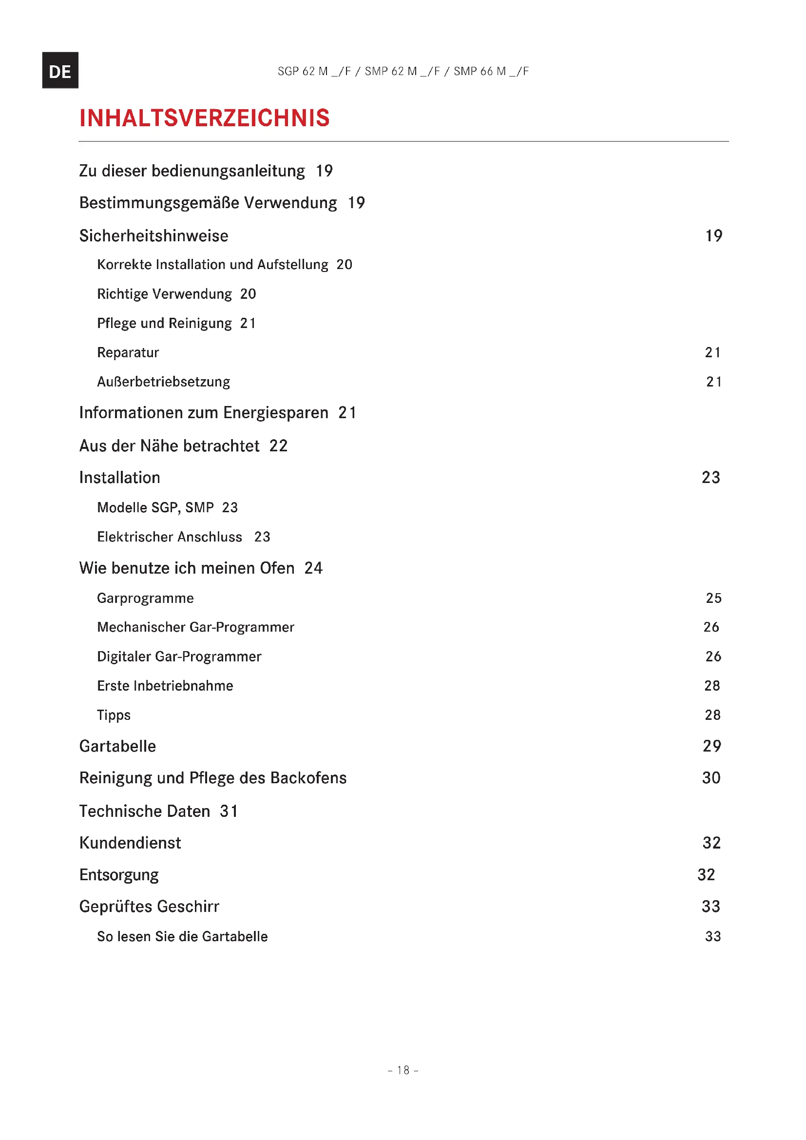 INHALTSVERZEICHNIS Zu dieser bedienungsanleitung 19 Bestimmungsgemäße Verwendung 19 Sicherheitshinweise 19 Korrekte Installation und Aufstellung 20 Richtige Verwendung 20 Pflege und Reinigung 21 Reparatur 21 Außerbetriebsetzung 21 Informationen zum Energiesparen 21 Aus der Nähe betrachtet 22 Installation 23 Modelle SGP, SMP 23 Elektrischer Anschluss 23 Wie benutze ich meinen Ofen 24 Garprogramme 25 Mechanischer Gar-Programmer 26 Digitaler Gar-Programmer 26 Erste Inbetriebnahme 28 Tipps 28 Gartabelle 29 Reinigung und Pflege des Backofens 30 Technische Daten 31 Kundendienst 32 Entsorgung 32 Geprüftes Geschirr 33 So lesen Sie die Gartabelle 33SGP 62 M _/F / SMP 62 M _/F / SMP 66 M _/F– 19 –