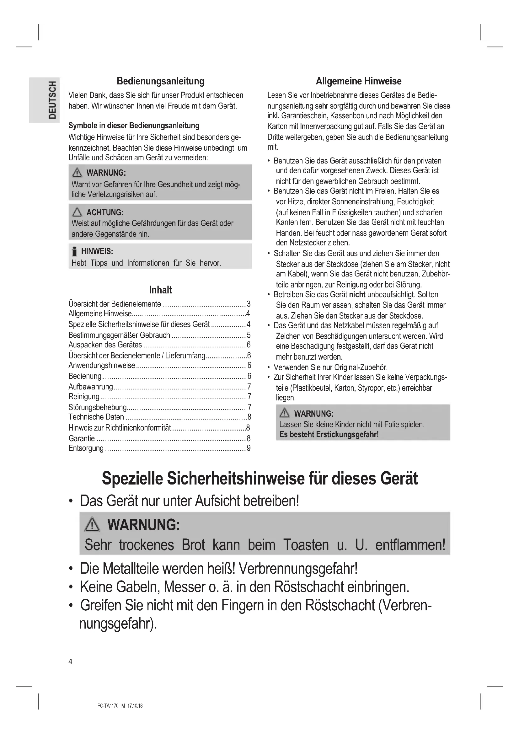 - Kinder, die jünger sind als 8 Jahre, sind von dem Gerät und der Anschlussleitung fernzuhalten. ACHTUNG: Dieses Gerät ist nicht dazu bestimmt, bei der Reinigung in Wasser eingetaucht zu werden. Beachten Sie die Anweisungen, die wir Ihnen im Kapitel „Reinigung“ dazu geben. Bestimmungsgemäßer Gebrauch Dieses Gerät dient zum Rösten von Brotscheiben und Bröt- chen unter Verwendung des Brötchenaufsatzes. Es ist für den Gebrauch im Haushalt und ähnlichen An- wendungsbereichen vorgesehen. Es darf nur in der Art und Weise benutzt werden, wie es in dieser Bedienungs- anleitung beschrieben ist. Sie dürfen das Gerät nicht für gewerbliche Zwecke einsetzen. Jede andere Verwendung gilt als nicht bestimmungsgemäß und kann zu Sachschäden oder sogar zu Personenschäden führen. Der Hersteller übernimmt keine Haftung für Schäden, die durch nicht bestimmungsgemäßen Gebrauch entstehen.PC-TA1170_IM 17.10.18