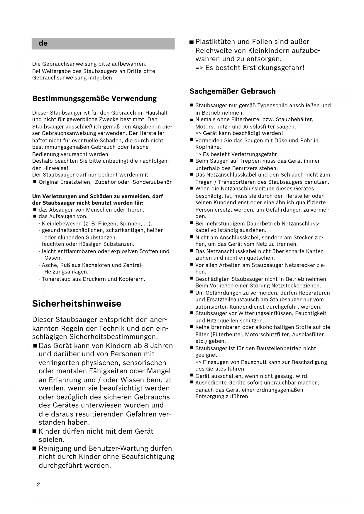 - 111 ar2 Plastiktüten und Folien sind außer Reichweite von Kleinkindern aufzube- wahren und zu entsorgen. => Es besteht Erstickungsgefahr! Sachgemäßer Gebrauch Staubsauger nur gemäß Typenschild anschließen und in Betrieb nehmen. Niemals ohne Filterbeutel bzw. Staubbehälter, Motorschutz - und Ausblasfilter saugen. => Gerät kann beschädigt werden! Vermeiden Sie das Saugen mit Düse und Rohr in Kopfnähe. => Es besteht Verletzungsgefahr! Beim Saugen auf Treppen muss das Gerät immer unterhalb des Benutzers stehen. Das Netzanschlusskabel und den Schlauch nicht zum Tragen / Transportieren des Staubsaugers benutzen. Wenn die Netzanschlussleitung dieses Gerätes beschädigt ist, muss sie durch den Hersteller oder seinen Kundendienst oder eine ähnlich qualifizierte Person ersetzt werden, um Gefährdungen zu vermei- den. Bei mehrstündigem Dauerbetrieb Netzanschluss- kabel vollständig ausziehen. Nicht am Anschlusskabel, sondern am Stecker zie- hen, um das Gerät vom Netz zu trennen. Das Netzanschlusskabel nicht über scharfe Kanten ziehen und nicht einquetschen. Vor allen Arbeiten am Staubsauger Netzstecker zie- hen. Beschädigten Staubsauger nicht in Betrieb nehmen. Beim Vorliegen einer Störung Netzstecker ziehen. Um Gefährdungen zu vermeiden, dürfen Reparaturen und Ersatzteileaustausch am Staubsauger nur vom autorisierten Kundendienst durchgeführt werden. Staubsauger vor Witterungseinflüssen, Feuchtigkeit und Hitzequellen schützen. Keine brennbaren oder alkoholhaltigen Stoffe auf die Filter (Filterbeutel, Motorschutzfilter, Ausblasfilter etc.) geben. Staubsauger ist für den Baustellenbetrieb nicht geeignet. => Einsaugen von Bauschutt kann zur Beschädigung des Gerätes führen. Gerät ausschalten, wenn nicht gesaugt wird. Ausgediente Geräte sofort unbrauchbar machen, danach das Gerät einer ordnungsgemäßen Entsorgung zuführen. p. 28