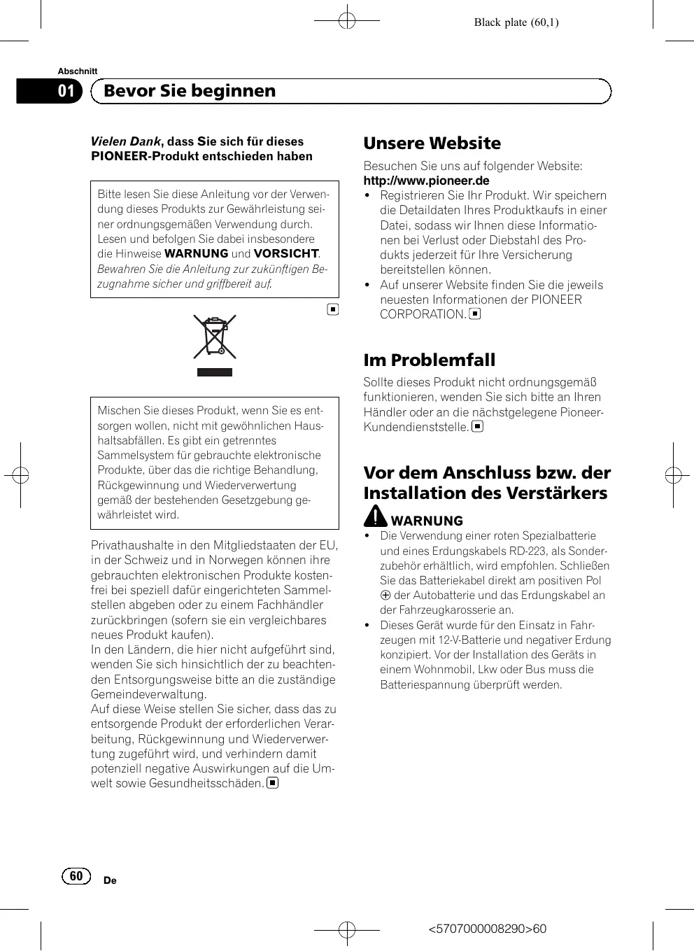 <5707000008290>60 Black plate (61,1) Abschnitt Bevor Sie beginnen tebetriebs zu verhindern. Schalten Sie in diesem Fall das System aus und überprüfen Sie die Anschlüsse der Spannungsversorgung und der Lautsprecher. Wenden Sie sich an Ihren Händler, falls Sie die Fehlerursache nicht identifizieren können. ! Trennen Sie stets zuerst die Verbindung des negativen Pols * der Batterie, um jede Gefahr eines elektrischen Schlags oder eines Kurzschlusses während der Installation zu vermeiden. ! Versuchen Sie nicht, dieses Gerät in seine Einzelteile zu zerlegen oder zu verändern, da dies zu Brand, Stromschlag oder anderen Störungen führen kann. VORSICHT ! Wählen Sie stets eine Lautstärke, bei der Sie Umgebungsgeräusche noch deutlich wahrnehmen können. ! Die längere Verwendung der Kfz-Stereoanlage bei ausgeschaltetem oder im Leerlauf befindlichen Motor kann zur Entleerung der Fahrzeugbatterie führen. Zur Schutzfunktion Dieses Produkt verfügt über eine Schutzfunktion. Wenn dieses Produkt einen anormalen Zustand erkennt, werden die folgenden Funktionen ausgelöst, um das Produkt und den Lautsprecherausgang zu schützen. ! Die Betriebsanzeige erlischt und der Verstärker schaltet sich unter den nachfolgend beschriebenen Bedingungen aus. — Wenn sich die Lautsprecherausgangsklemme und das Lautsprecherkabel kurzschließen. — Wenn an die Lautsprecherausgangsklemme eine Gleichspannung angelegt wird. ! Wenn sich die Temperatur im Inneren des Verstärkers erhöht, reduziert er seine Ausgangsleistung. Wird die Temperatur zu hoch, erlischt die Betriebsanzeige und der Verstärker schaltet sich aus.