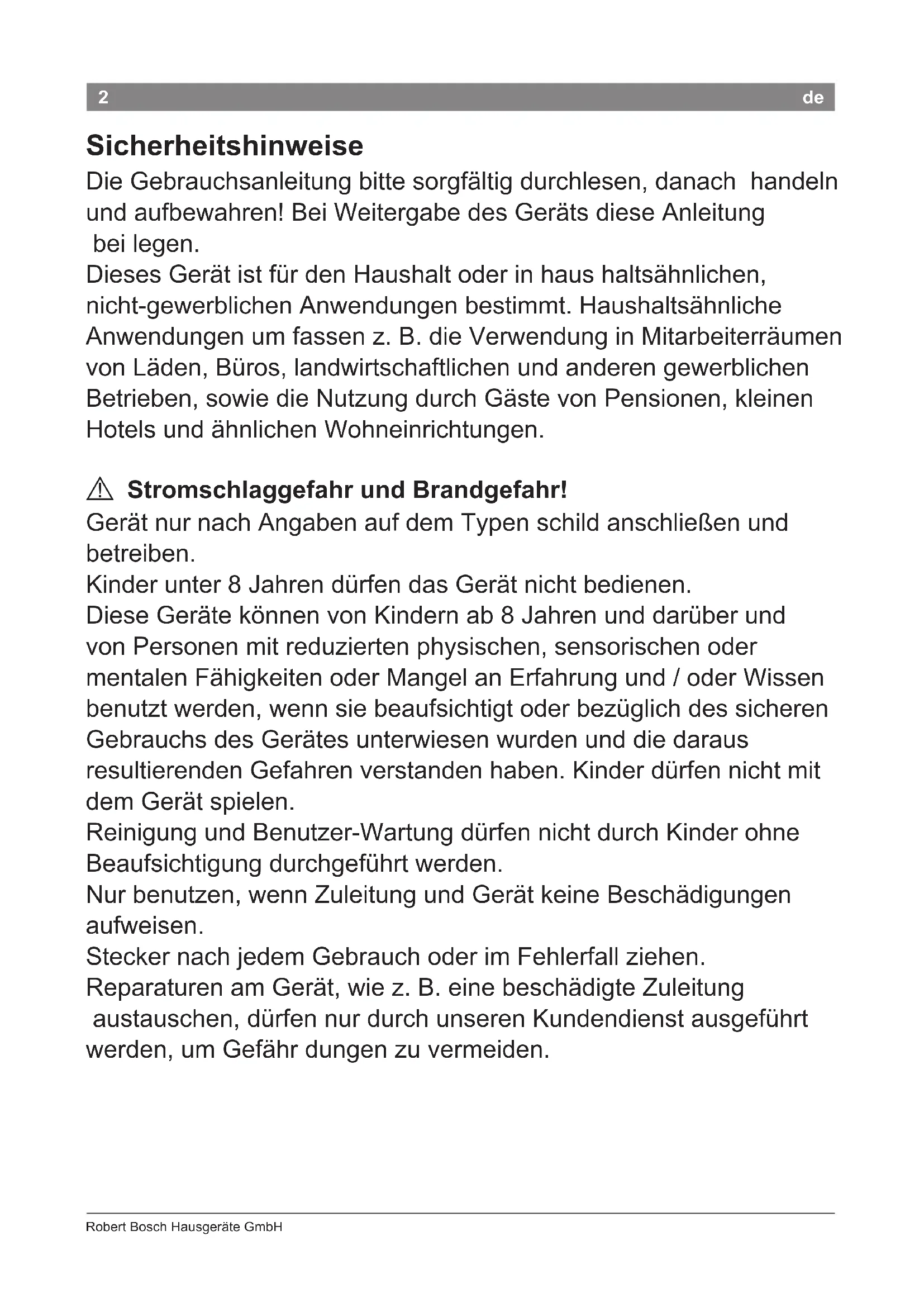 RobertBoschHausgeräteGmbH 2 de Sicherheitshinweise DieGebrauchsanleitungbittesorgfältigdurchlesen,danachhandeln undaufbewahren!BeiWeitergabedesGerätsdieseAnleitung beilegen. DiesesGerätistfürdenHaushaltoderinhaushaltsähnlichen, nicht-gewerblichenAnwendungenbestimmt.Haushaltsähnliche Anwendungenumfassenz.B.dieVerwendunginMitarbeiterräumen vonLäden,Büros,landwirtschaftlichenundanderengewerblichen Betrieben,sowiedieNutzungdurchGästevonPensionen,kleinen HotelsundähnlichenWohneinrichtungen.