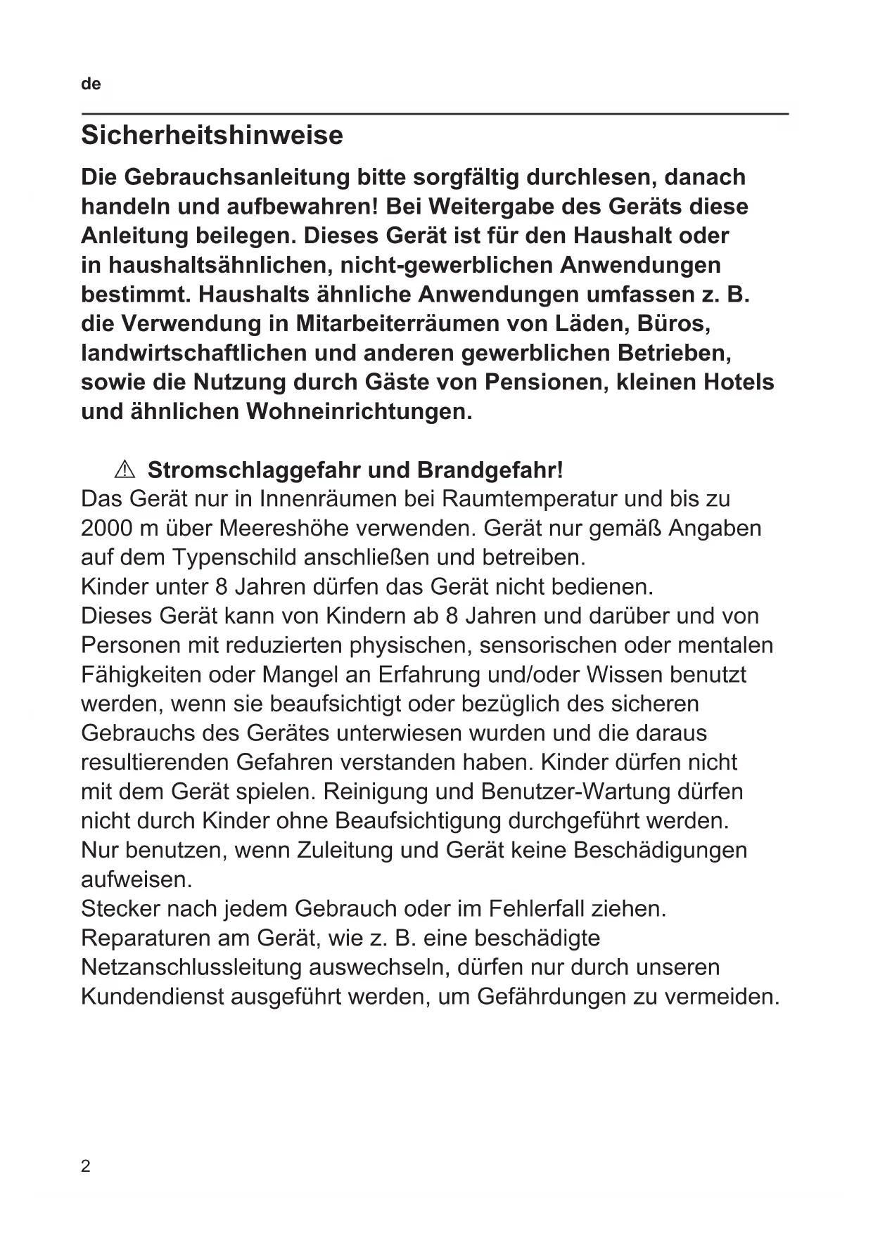 Sicherheitshinweise Die Gebrauchsanleitung bitte sorgfältig durchlesen, danach handeln und aufbewahren! Bei Weitergabe des Geräts diese Anleitung beilegen. Dieses Gerät ist für den Haushalt oder in haushaltsähnlichen, nicht-gewerblichen Anwendungen bestimmt. Haushalts ähnliche Anwendungen umfassen z. B. die Verwendung in Mitarbeiterräumen von Läden, Büros, landwirtschaftlichen und anderen gewerblichen Betrieben, sowie die Nutzung durch Gäste von Pensionen, kleinen Hotels und ähnlichen Wohneinrichtungen. A Stromschlaggefahr und Brandgefahr! Das Gerät nur in Innenräumen bei Raumtemperatur und bis zu 2000 m über Meereshöhe verwenden. Gerät nur gemäß Angaben auf dem Typenschild anschließen und betreiben. Kinder unter 8 Jahren dürfen das Gerät nicht bedienen. Dieses Gerät kann von Kindern ab 8 Jahren und darüber und von Personen mit reduzierten physischen, sensorischen oder mentalen Fähigkeiten oder Mangel an Erfahrung und/oder Wissen benutzt werden, wenn sie beaufsichtigt oder bezüglich des sicheren Gebrauchs des Gerätes unterwiesen wurden und die daraus resultierenden Gefahren verstanden haben. Kinder dürfen nicht mit dem Gerät spielen. Reinigung und Benutzer-Wartung dürfen nicht durch Kinder ohne Beaufsichtigung durchgeführt werden. Nur benutzen, wenn Zuleitung und Gerät keine Beschädigungen aufweisen. Stecker nach jedem Gebrauch oder im Fehlerfall ziehen. Reparaturen am Gerät, wie z. B. eine beschädigte Netzanschlussleitung auswechseln, dürfen nur durch unseren Kundendienst ausgeführt werden, um Gefährdungen zu vermeiden.3