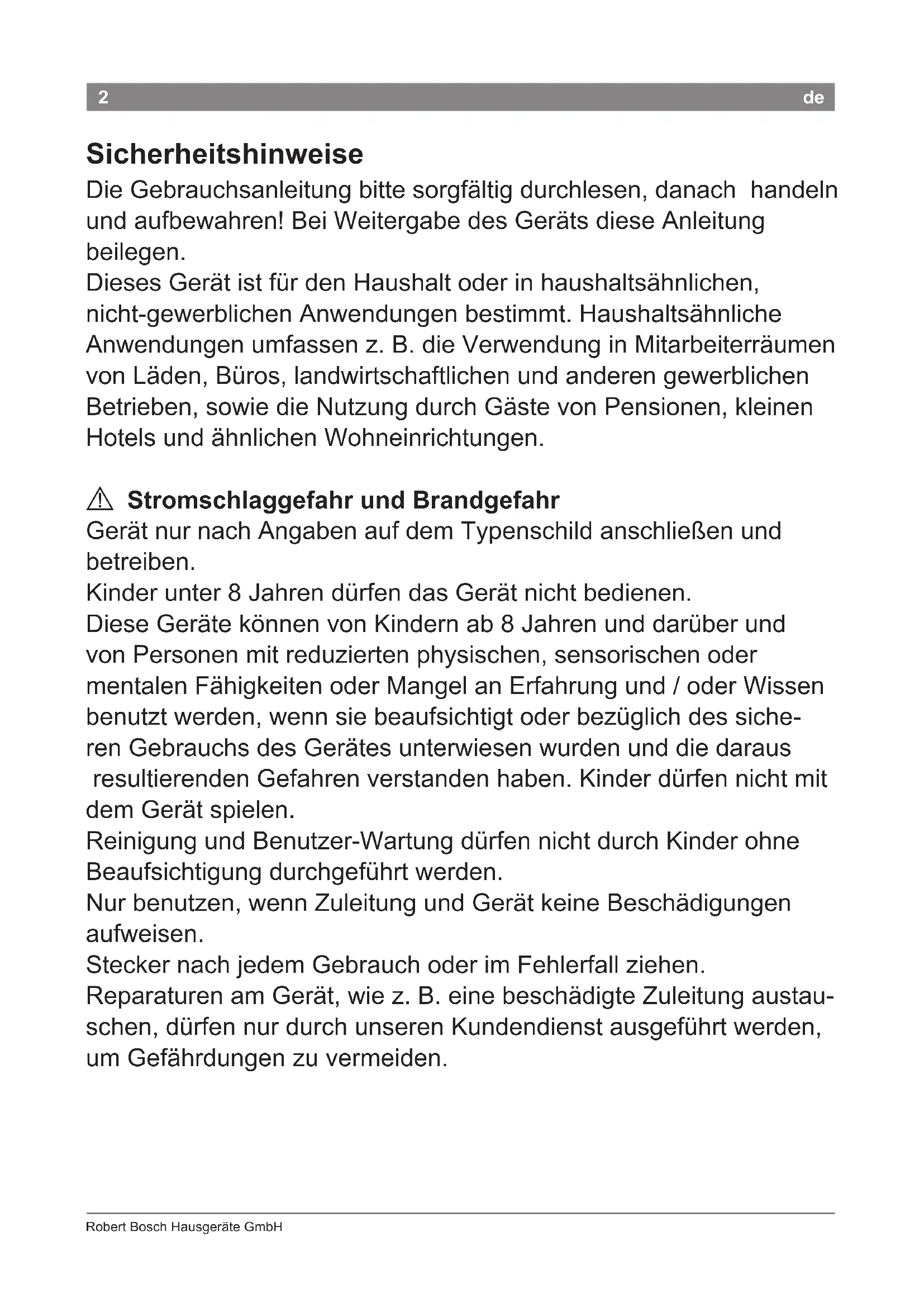 Robert Bosch Hausgeräte GmbH 2 de Sicherheitshinweise Die Gebrauchsanleitung bitte sorgfältig durchlesen, danach handeln und aufbewahren! Bei Weitergabe des Geräts diese Anleitung beilegen. Dieses Gerät ist für den Haushalt oder in haushaltsähnlichen, nicht-gewerblichen Anwendungen bestimmt. Haushaltsähnliche Anwendungen umfassen z. B. die Verwendung in Mitarbeiterräumen von Läden, Büros, landwirtschaftlichen und anderen gewerblichen Betrieben, sowie die Nutzung durch Gäste von Pensionen, kleinen Hotels und ähnlichen Wohneinrichtungen.