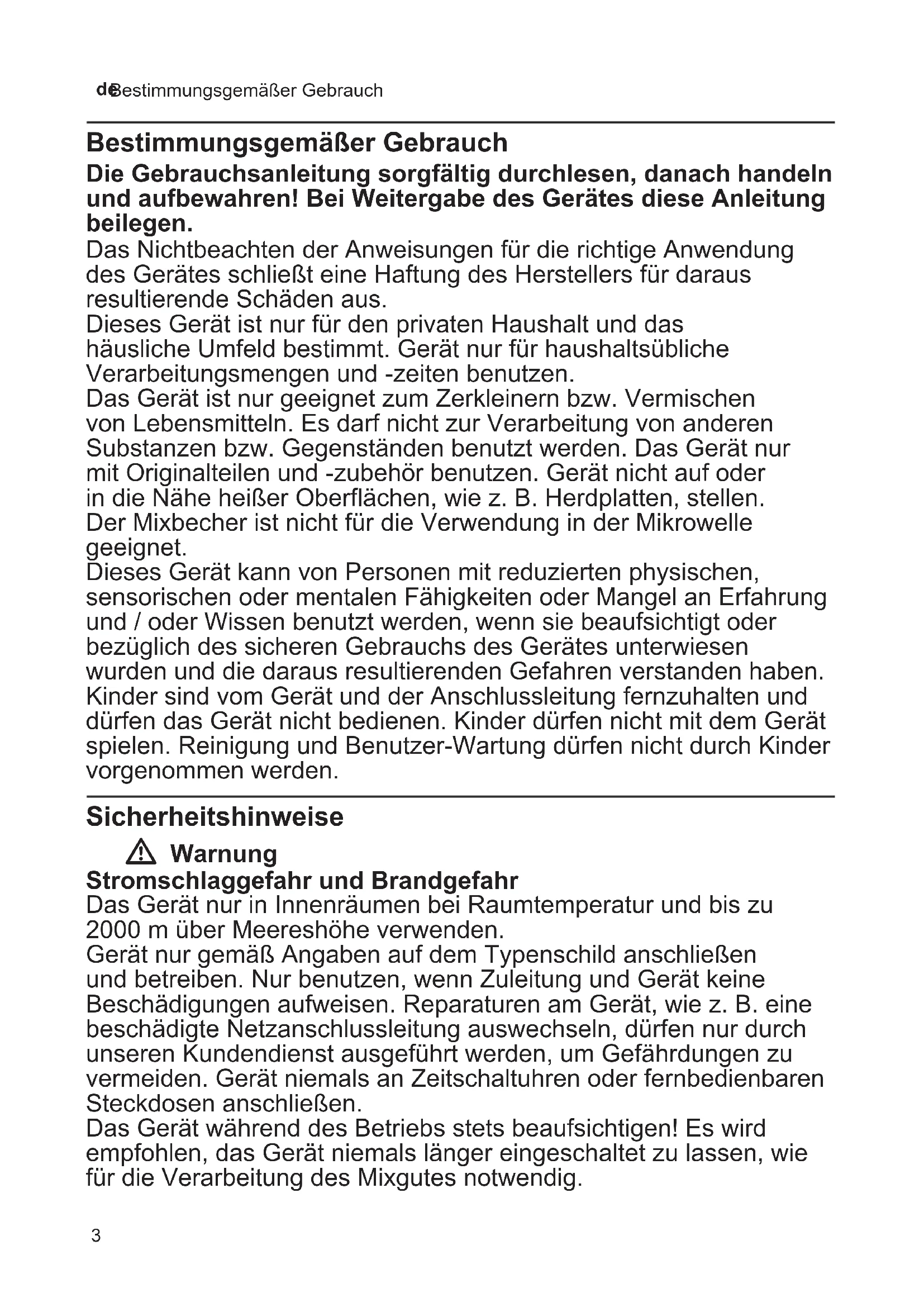 - Bestimmungsgemäßer Gebrauch Bestimmungsgemäßer Gebrauch Die Gebrauchsanleitung sorgfältig durchlesen, danach handeln und aufbewahren! Bei Weitergabe des Gerätes diese Anleitung beilegen. Das Nichtbeachten der Anweisungen für die richtige Anwendung des Gerätes schließt eine Haftung des Herstellers für daraus resultierende Schäden aus. Dieses Gerät ist nur für den privaten Haushalt und das häusliche Umfeld bestimmt. Gerät nur für haushaltsübliche Verarbeitungsmengen und -zeiten benutzen. Das Gerät ist nur geeignet zum Zerkleinern bzw. Vermischen von Lebensmitteln. Es darf nicht zur Verarbeitung von anderen Substanzen bzw. Gegenständen benutzt werden. Das Gerät nur mit Originalteilen und -zubehör benutzen. Gerät nicht auf oder in die Nähe heißer Oberflächen, wie z. B. Herdplatten, stellen. Der Mixbecher ist nicht für die Verwendung in der Mikrowelle geeignet. Dieses Gerät kann von Personen mit reduzierten physischen, sensorischen oder mentalen Fähigkeiten oder Mangel an Erfahrung und / oder Wissen benutzt werden, wenn sie beaufsichtigt oder bezüglich des sicheren Gebrauchs des Gerätes unterwiesen wurden und die daraus resultierenden Gefahren verstanden haben. Kinder sind vom Gerät und der Anschlussleitung fernzuhalten und dürfen das Gerät nicht bedienen. Kinder dürfen nicht mit dem Gerät spielen. Reinigung und Benutzer-Wartung dürfen nicht durch Kinder vorgenommen werden. Sicherheitshinweise W Warnung Stromschlaggefahr und Brandgefahr Das Gerät nur in Innenräumen bei Raumtemperatur und bis zu 2000 m über Meereshöhe verwenden. Gerät nur gemäß Angaben auf dem Typenschild anschließen und betreiben. Nur benutzen, wenn Zuleitung und Gerät keine Beschädigungen aufweisen. Reparaturen am Gerät, wie z. B. eine beschädigte Netzanschlussleitung auswechseln, dürfen nur durch unseren Kundendienst ausgeführt werden, um Gefährdungen zu vermeiden. Gerät niemals an Zeitschaltuhren oder fernbedienbaren Steckdosen anschließen. Das Gerät während des Betriebs stets beaufsichtigen! Es wird empfohlen, das Gerät niemals länger eingeschaltet zu lassen, wie für die Verarbeitung des Mixgutes notwendig.4 de Sicherheitshinweise Herzlichen Glückwunsch zum Kauf Ihres neuen Gerätes aus dem Hause Bosch. Weitere Informationen zu unseren Produkten finden Sie auf unserer Internetseite. Inhalt Bestimmungsgemäßer Gebrauch p. 3