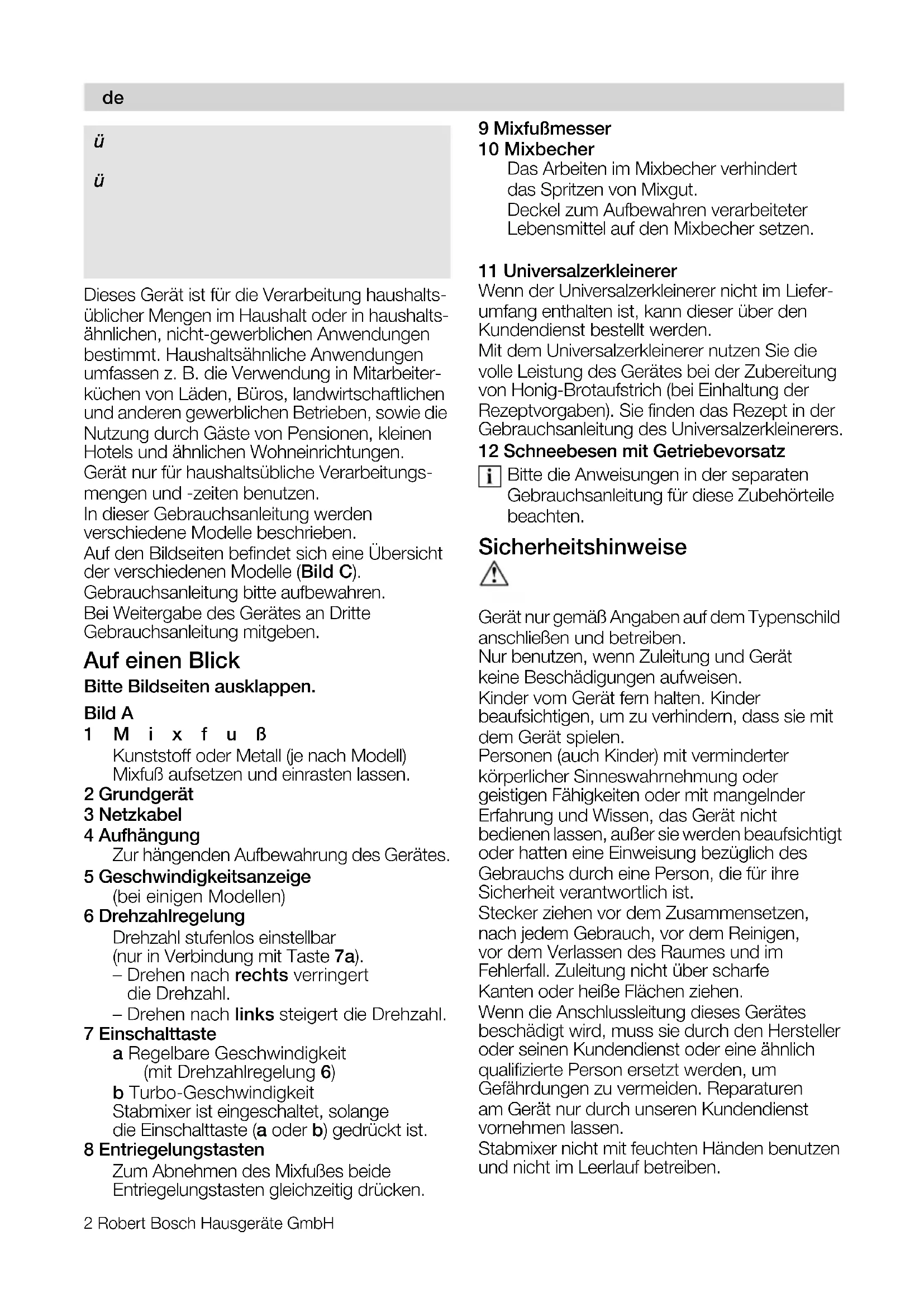 eÉêòäáÅÜÉå=däΩÅâïìåëÅÜ=òìã=h~ìÑ=fÜêÉë= åÉìÉå=dÉê®íÉë=~ìë=ÇÉã=e~ìëÉ=_lp`eK a~ãáí=Ü~ÄÉå=páÉ=ëáÅÜ=ÑΩê=Éáå=ãçÇÉêåÉëI= ÜçÅÜïÉêíáÖÉë=e~ìëÜ~äíëÖÉê®í=ÉåíëÅÜáÉÇÉåK= tÉáíÉêÉ=fåÑçêã~íáçåÉå=òì=ìåëÉêÉå= mêçÇìâíÉå=ÑáåÇÉå=páÉ=~ìÑ=ìåëÉêÉê= fåíÉêåÉíëÉáíÉKRobert Bosch Hausgeräte GmbH 3 Stabmixer nur mit Originalzubehör betreiben. Vorsicht bei der Verarbeitung heißer Flüssig- keiten. Flüssigkeiten können bei der Verarbeitung spritzen. Das Gerät nicht über die Verbindungsstelle Mixfuß-Grundgerät in Flüssigkeit eintauchen. Es wird empfohlen, das Gerät niemals länger eingeschaltet zu lassen, wie für die Verarbeitung des Mixgutes notwendig. Mixfuss niemals auf heiße Oberflächen stellen oder in sehr heißem Mixgut benutzen. Heißes Mixgut vor der Verarbeitung mit dem Mixer auf 80 °C oder weniger abkühlen lassen! sÉêäÉíòìåÖëÖÉÑ~Üê=ÇìêÅÜ=ëÅÜ~êÑÉ= jÉëëÉêLêçíáÉêÉåÇÉå=^åíêáÉÄ káÉ=áå=Ç~ë=jÉëëÉê=~ã=jáñÑì≈=ÖêÉáÑÉåK= jáñÑì≈ãÉëëÉê=åáÉ=ãáí=Ääç≈Éå=e®åÇÉå=êÉáåáÖÉåK= _ΩêëíÉ=ÄÉåìíòÉåK táÅÜíáÖ> jáñÑì≈=åìê=ÄÉá=píáääëí~åÇ=ÇÉë=dÉê®íÉë=~ìÑëÉíòÉå= ìåÇ=~ÄåÉÜãÉåK Bedienen Zum Mixen von Mayonnaisen, Saucen, Mix- getränken, Babynahrung, gekochtem Obst und Gemüse. Zum Pürieren von Suppen. Zum Zerkleinern/Hacken von rohen Lebens- mitteln (Zwiebeln, Knoblauch, Kräuter) den Universalzerkleinerer benutzen! Der Stabmixer ist nicht geeignet für die Zubereitung von Kartoffelpüree. Vor dem ersten Gebrauch alle Teile reinigen. Bild B Netzkabel vollständig abwickeln. Mixfuß auf das Grundgerät setzen und einrasten lassen. Netzstecker einstecken. Lebensmittel in den Mixbecher oder einen anderen hohen Becher einfüllen. Der Stabmixer funktioniert besser, wenn sich bei den zu verarbeitenden Lebens- mitteln eine Flüssigkeit befindet. Gewünschte Drehzahl mit der Drehzahlregelung einstellen. – Drehen nach rechts verringert die Drehzahl. – Drehen nach links steigert die Drehzahl. Im Allgemeinen ist die Turbo-Geschwindig- keit für die Verarbeitung von Lebensmitteln zu empfehlen. Bei Flüssigkeiten, heißem Mixgut und zum Untermischen (z. B. Müssli in Joghurt) wird empfohlen, die Drehzahlregelung zu verwenden. Bei einigen Modellen: Die eingestellte Geschwindigkeit wird bei Betätigung der Einschalttaste über die Geschwindigkeitsanzeige dargestellt. Je mehr Segmente leuchten, desto höher ist die eingestellte Geschwindigkeit. Stabmixer und Becher fest halten. Stabmixer durch Druck auf die gewünschte Einschalttaste einschalten. Der Stabmixer ist so lange eingeschaltet, wie die Einschalttaste gedrückt wird. Um das Spritzen von Mixgut zu vermeiden, Einschalttaste erst drücken, wenn der Mixfuß in das Mixgut eingetaucht ist. Stabmixer immer abschalten, bevor er aus dem Mixgut herausgenommen wird. Nach der Verarbeitung die Einschalttaste loslassen. Netzstecker ziehen. Entriegelungstasten drücken und Mixfuß vom Grundgerät nehmen. Reinigen ^ÅÜíìåÖ> a~ë=dêìåÇÖÉê®í=åáÉ=áå=t~ëëÉê=í~ìÅÜÉå=ìåÇ= åáÅÜí=áå=ÇÉê=péΩäã~ëÅÜáåÉ=êÉáåáÖÉåK hÉáåÉå=a~ãéÑêÉáåáÖÉê=ÄÉåìíòÉå> lÄÉêÑä®ÅÜÉå=â∏ååÉå=ÄÉëÅÜ®ÇáÖí=ïÉêÇÉåK= hÉáåÉ=ëÅÜÉìÉêåÇÉå=oÉáåáÖìåÖëãáííÉä= îÉêïÉåÇÉåK Netzstecker ziehen! Grundgerät feucht abwischen und anschließend trockenreiben. Der Mixbecher kann in der Spülmaschine gereinigt werden. Mixfuß in der Spülmaschine oder mit einer Bürste unter fließendem Wasser reinigen. Mixfuß in aufrechter Position (Mixfußmesser nach oben) trocknen lassen, so dass eingedrungenes Wasser herauslaufen kann. Bei der Verarbeitung von z. B. Rotkohl und Karotten entstehen Verfärbungen an den Kunststoffteilen, die mit einigen Tropfen Speiseöl entfernt werden können. de4 Robert Bosch Hausgeräte GmbH Hilfe bei Störungen Sollte sich die Störung nicht beseitigen lassen, wenden Sie sich bitte an den Kundendienst. Rezepte und Tipps Mayonnaise 1 Ei (Eigelb und Eiweiß) 1 EL Senf 1 EL Zitronensaft oder Essig 200–250 ml Öl Salz, Pfeffer nach Geschmack Zutaten müssen gleiche Temperatur haben! Zutaten in den Becher geben. Stabmixer auf dem Boden des Bechers aufsetzen und die Zutaten verrühren, bis die Mischung emulgiert. Den eingeschalteten Mixer langsam bis zum oberen Rand der Mischung anheben und wieder senken, bis die Mayonnaise fertig ist. Tipp: Sie können nach diesem Rezept auch Mayonnaise nur mit Eigelb herstellen. Dann aber nur die halbe Menge Öl verwenden. Gemüsesuppe 300 g Kartoffeln 200 g Möhren 1 kleines Stück Sellerie 2 Tomaten 1 Zwiebel 50 g Butter 2 l Wasser Salz, Pfeffer nach Geschmack Tomaten häuten und entkernen. Geputztes und gewaschenes Gemüse in Stücke schneiden und in der heißen Butter dünsten. Wasser zugeben und salzen. Alles 20–25 Min. kochen lassen. Topf vom Herd nehmen. Mit dem Mixer die Suppe im Topf pürieren. Mit Salz und Pfeffer abschmecken. Crêpes-Teig 250 ml Milch 1 Ei 100 g Mehl 25 g zerlassene abgekühlte Butter Alle Zutaten in der angegebenen Reihenfolge in den Becher geben und zu einem glatten Teig mixen. Milchmixgetränke 1 Glas Milch 6 große Erdbeeren oder 10 Himbeeren oder 1 Banane (in Scheiben schneiden) Zutaten in den Becher geben und mixen. Nach Belieben zuckern. Tipp: Für einen Milch-Shake geben Sie eine Kugel Eis dazu oder nehmen Sie sehr kalte Milch. Hinweise zur Entsorgung Dieses Gerät ist entsprechend der europäischen Richtlinie 2002/96/EG über Elektro- und Elektronik-Altgeräte (waste electrical and electronic equipment – WEEE) gekennzeichnet. Die Richtlinie gibt den Rahmen für eine EU-weit gültige Rücknahme und Verwertung der Altgeräte vor. Über aktuelle Entsorgungshinweise informiere