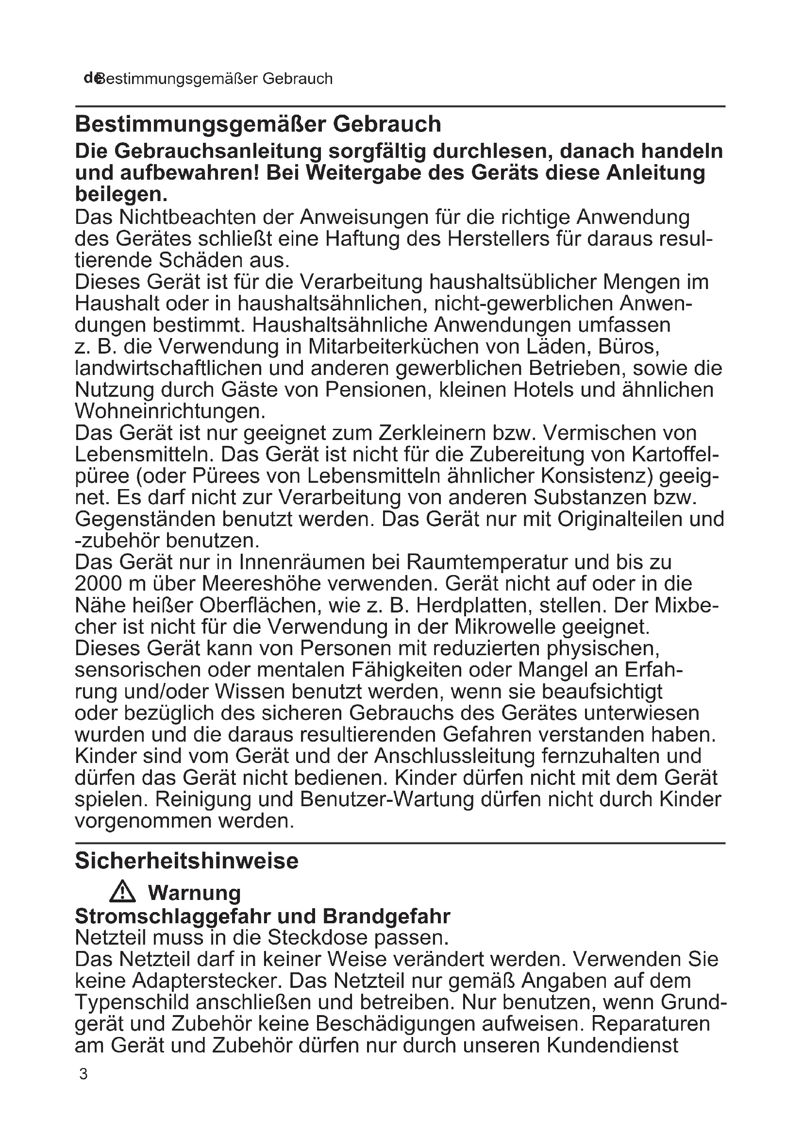 Bestimmungsgemäßer Gebrauch Bestimmungsgemäßer Gebrauch Die Gebrauchsanleitung sorgfältig durchlesen, danach handeln und aufbewahren! Bei Weitergabe des Geräts diese Anleitung beilegen. Das Nichtbeachten der Anweisungen für die richtige Anwendung des Gerätes schließt eine Haftung des Herstellers für daraus resul- tierende Schäden aus. Dieses Gerät ist für die Verarbeitung haushaltsüblicher Mengen im Haushalt oder in haushaltsähnlichen, nicht-gewerblichen Anwen- dungen bestimmt. Haushaltsähnliche Anwendungen umfassen z. B. die Verwendung in Mitarbeiterküchen von Läden, Büros, landwirtschaftlichen und anderen gewerblichen Betrieben, sowie die Nutzung durch Gäste von Pensionen, kleinen Hotels und ähnlichen Wohneinrichtungen. Das Gerät ist nur geeignet zum Zerkleinern bzw. Vermischen von Lebensmitteln. Das Gerät ist nicht für die Zubereitung von Kartoffel- püree (oder Pürees von Lebensmitteln ähnlicher Konsistenz) geeig- net. Es darf nicht zur Verarbeitung von anderen Substanzen bzw. Gegenständen benutzt werden. Das Gerät nur mit Originalteilen und -zubehör benutzen. Das Gerät nur in Innenräumen bei Raumtemperatur und bis zu 2000 m über Meereshöhe verwenden. Gerät nicht auf oder in die Nähe heißer Oberächen, wie z. B. Herdplatten, stellen. Der Mixbe- cher ist nicht für die Verwendung in der Mikrowelle geeignet. Dieses Gerät kann von Personen mit reduzierten physischen, sensorischen oder mentalen Fähigkeiten oder Mangel an Erfah- rung und/oder Wissen benutzt werden, wenn sie beaufsichtigt oder bezüglich des sicheren Gebrauchs des Gerätes unterwiesen wurden und die daraus resultierenden Gefahren verstanden haben. Kinder sind vom Gerät und der Anschlussleitung fernzuhalten und dürfen das Gerät nicht bedienen. Kinder dürfen nicht mit dem Gerät spielen. Reinigung und Benutzer-Wartung dürfen nicht durch Kinder vorgenommen werden. Sicherheitshinweise W Warnung Stromschlaggefahr und Brandgefahr Netzteil muss in die Steckdose passen. Das Netzteil darf in keiner Weise verändert werden. Verwenden Sie keine Adapterstecker. Das Netzteil nur gemäß Angaben auf dem Typenschild anschließen und betreiben. Nur benutzen, wenn Grund- gerät und Zubehör keine Beschädigungen aufweisen. Reparaturen am Gerät und Zubehör dürfen nur durch unseren Kundendienst4 de Sicherheitshinweise ausgeführt werden, um Gefährdungen zu vermeiden. Akkus nur von unserem Kundendienst austauschen lassen. Nur vollständige, nicht demontierte Geräte mit mechanisch unbeschädigten Akkus versen- den. Niemals Akkus entnehmen und getrennt versenden. Das Gerät während des Betriebs stets beaufsichtigen! Das Anschlusskabel nicht mit heißen Teilen in Berührung bringen oder über scharfe Kanten ziehen. Grundgerät, Ladestation und Netzteil niemals in Wasser tauchen oder in den Geschirrspüler geben. Das Gerät nicht mit feuchten Händen benutzen und nicht im Leerlauf betreiben. Das Gerät nicht über die Verbindungsstelle von Mixfuß und Grundgerät in das Mixgut eintauchen. Das Netzteil muss bei längerer Nichtbenutzung, nach dem voll- ständigen Laden der Akkus, vor dem Zusammenbau, Auseinander- nehmen oder Reinigen und im Fehlerfall stets vom Netz getrennt werden. Grundgerät nur in der mitgelieferten Ladestation und mit dem dazugehörigem Netzteil laden. Netzteil nicht abdecken. Leicht brennbare Gegenstände fernhalten. W Warnung Explosionsgefahr! Akkus vor Hitze und Feuer schützen. W Warnung Verletzungsgefahr Nach dem unmittelbaren Einsatz des Gerätes den Stillstand des Mixfußmessers abwarten. Vor dem Auswechseln von Zubehör- oder Zusatzteilen, die im Betrieb bewegt werden, muss das Gerät ausgeschaltet werden. Niemals in das Mixfußmesser greifen. Das Mixfußmesser niemals mit bloßen Händen reinigen. Bei falscher Anwendung kann Flüssigkeit aus dem Akku im Grund- gerät austreten. Vermeiden Sie den Kontakt damit. W Warnung Verbrühungsgefahr Vorsicht bei der Verarbeitung von heißem Mixgut. Heißes Mixgut kann bei der Verarbeitung spritzen. Mixfuß niemals auf heiße Oberächen stellen oder in sehr heißem Mixgut benutzen. Kochen- des Mixgut vor der Verarbeitung auf 80°C oder weniger abkühlen lassen. Bei Verwendung des Stabmixers im Kochtopf den Topf vorher von der Kochstelle nehmen. W Warnung Erstickungsgefahr Kinder nicht mit dem Verpackungsmaterial spielen lassen.5