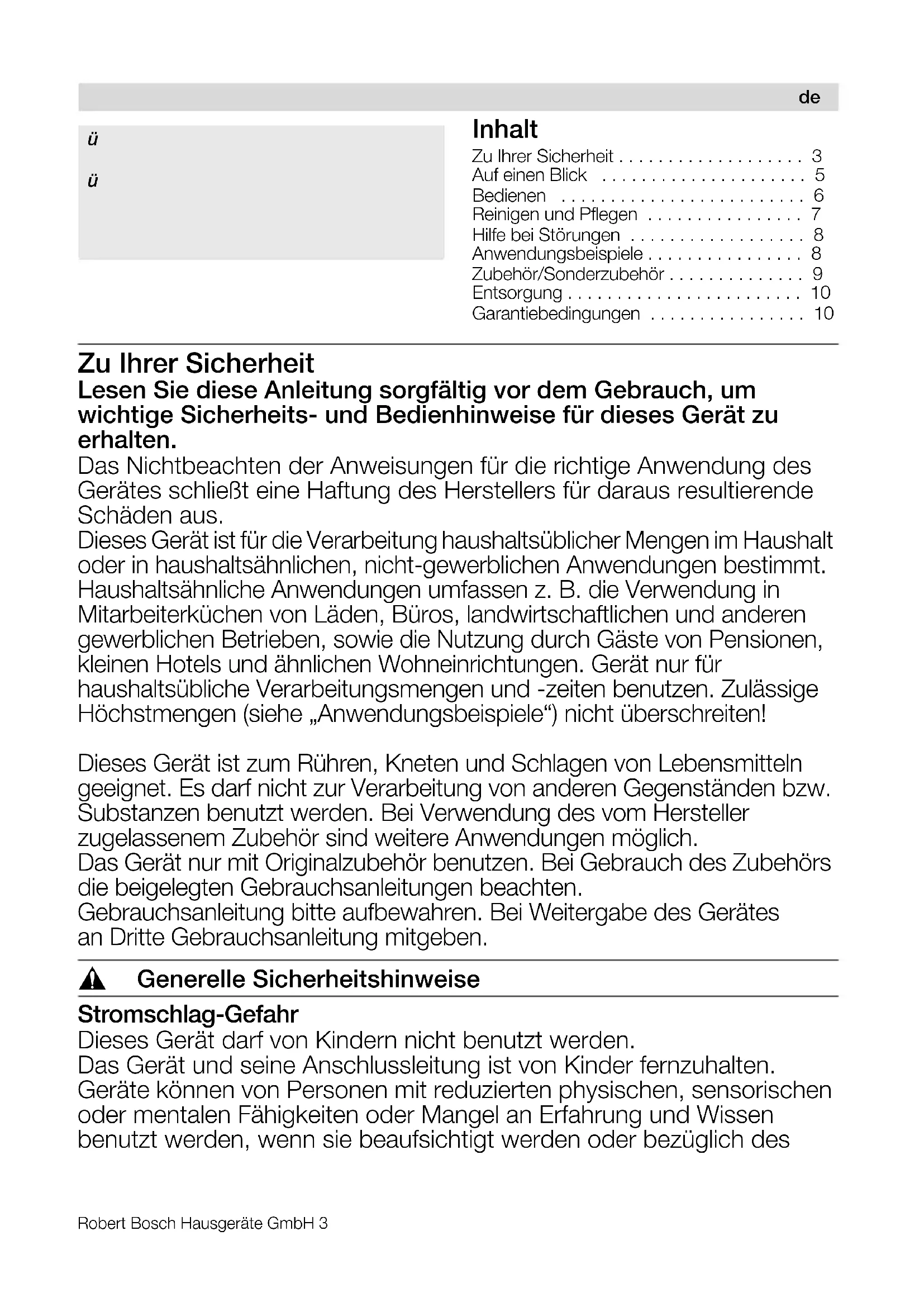 MUM44.. MUM46.. MUM48..de Deutsch . . . . . . . . . . . . . . . . . . . . . . . . . . . . . . . . . . . . . . . . . . . . . . . . . . . . . . . . . . . 3 en English . . . . . . . . . . . . . . . . . . . . . . . . . . . . . . . . . . . . . . . . . . . . . . . . . . . . . . . . . . . .11 fr Français . . . . . . . . . . . . . . . . . . . . . . . . . . . . . . . . . . . . . . . . . . . . . . . . . . . . . . . . . . .19 it Italiano . . . . . . . . . . . . . . . . . . . . . . . . . . . . . . . . . . . . . . . . . . . . . . . . . . . . . . . . . . . . 28 nl Nederlands . . . . . . . . . . . . . . . . . . . . . . . . . . . . . . . . . . . . . . . . . . . . . . . . . . . . . . . . . 36 da Dansk . . . . . . . . . . . . . . . . . . . . . . . . . . . . . . . . . . . . . . . . . . . . . . . . . . . . . . . . . . . . .44 no Norsk. . . . . . . . . . . . . . . . . . . . . . . . . . . . . . . . . . . . . . . . . . . . . . . . . . . . . . . . . . . . . . 52 sv Svenska . . . . . . . . . . . . . . . . . . . . . . . . . . . . . . . . . . . . . . . . . . . . . . . . . . . . . . . . . . . 60 fi Suomi . . . . . . . . . . . . . . . . . . . . . . . . . . . . . . . . . . . . . . . . . . . . . . . . . . . . . . . . . . . . .68 es Español. . . . . . . . . . . . . . . . . . . . . . . . . . . . . . . . . . . . . . . . . . . . . . . . . . . . . . . . . . . .76 pt Português. . . . . . . . . . . . . . . . . . . . . . . . . . . . . . . . . . . . . . . . . . . . . . . . . . . . . . . . . . 86 el ÅëëçíéêÜ . . . . . . . . . . . . . . . . . . . . . . . . . . . . . . . . . . . . . . . . . . . . . . . . . . . . . . . . . . . 95 tr Türkçe. . . . . . . . . . . . . . . . . . . . . . . . . . . . . . . . . . . . . . . . . . . . . . . . . . . . . . . . . . . . 105 pl Polski . . . . . . . . . . . . . . . . . . . . . . . . . . . . . . . . . . . . . . . . . . . . . . . . . . . . . . . . . . . .116 hu Magyar . . . . . . . . . . . . . . . . . . . . . . . . . . . . . . . . . . . . . . . . . . . . . . . . . . . . . . . . . . . 125 uk š®paï¸c¿®a . . . . . . . . . . . . . . . . . . . . . . . . . . . . . . . . . . . . . . . . . . . . . . . . . . . . . . . . 133 ru Pºcc®å¼ . . . . . . . . . . . . . . . . . . . . . . . . . . . . . . . . . . . . . . . . . . . . . . . . . . . . . . . . . . 142 ar . . . . . . . . . . . . . . . . . . . . . . . . . . . . . . . . . . . . . . . . . . . . . . . . . . . . . . . . . . . . . 164 . . . . . . . . . . . . . . . . . . . . . . . . . . . . . . . . . . . . . . . . . . . . . . . . . . . .Robert Bosch Hausgeräte GmbH 3 Inhalt Zu Ihrer Sicherheit . . . . . . . . . . . . . . . . . . . 3 Auf einen Blick . . . . . . . . . . . . . . . . . . . . . 5 Bedienen . . . . . . . . . . . . . . . . . . . . . . . . . 6 Reinigen und Pflegen . . . . . . . . . . . . . . . . 7 Hilfe bei Störungen . . . . . . . . . . . . . . . . . . 8 Anwendungsbeispiele . . . . . . . . . . . . . . . . 8 Zubehör/Sonderzubehör . . . . . . . . . . . . . . 9 Entsorgung . . . . . . . . . . . . . . . . . . . . . . . . 10 Garantiebedingungen . . . . . . . . . . . . . . . . 10 Zu Ihrer Sicherheit Lesen Sie diese Anleitung sorgfältig vor dem Gebrauch, um wichtige Sicherheits- und Bedienhinweise für dieses Gerät zu erhalten. Das Nichtbeachten der Anweisungen für die richtige Anwendung des Gerätes schließt eine Haftung des Herstellers für daraus resultierende Schäden aus. Dieses Gerät ist für die Verarbeitung haushaltsüblicher Mengen im Haushalt oder in haushaltsähnlichen, nicht-gewerblichen Anwendungen bestimmt. Haushaltsähnliche Anwendungen umfassen z. B. die Verwendung in Mitarbeiterküchen von Läden, Büros, landwirtschaftlichen und anderen gewerblichen Betrieben, sowie die Nutzung durch Gäste von Pensionen, kleinen Hotels und ähnlichen Wohneinrichtungen. Gerät nur für haushaltsübliche Verarbeitungsmengen und -zeiten benutzen. Zulässige Höchstmengen (siehe „Anwendungsbeispiele“) nicht überschreiten! Dieses Gerät ist zum Rühren, Kneten und Schlagen von Lebensmitteln geeignet. Es darf nicht zur Verarbeitung von anderen Gegenständen bzw. Substanzen benutzt werden. Bei Verwendung des vom Hersteller zugelassenem Zubehör sind weitere Anwendungen möglich. Das Gerät nur mit Originalzubehör benutzen. Bei Gebrauch des Zubehörs die beigelegten Gebrauchsanleitungen beachten. Gebrauchsanleitung bitte aufbewahren. Bei Weitergabe des Gerätes an Dritte Gebrauchsanleitung mitgeben. , Generelle Sicherheitshinweise Stromschlag-Gefahr Dieses Gerät darf von Kindern nicht benutzt werden. Das Gerät und seine Anschlussleitung ist von Kinder fernzuhalten. Geräte können von Personen mit reduzierten physischen, sensorischen oder mentalen Fähigkeiten oder Mangel an Erfahrung und Wissen benutzt werden, wenn sie beaufsichtigt werden oder bezüglich des