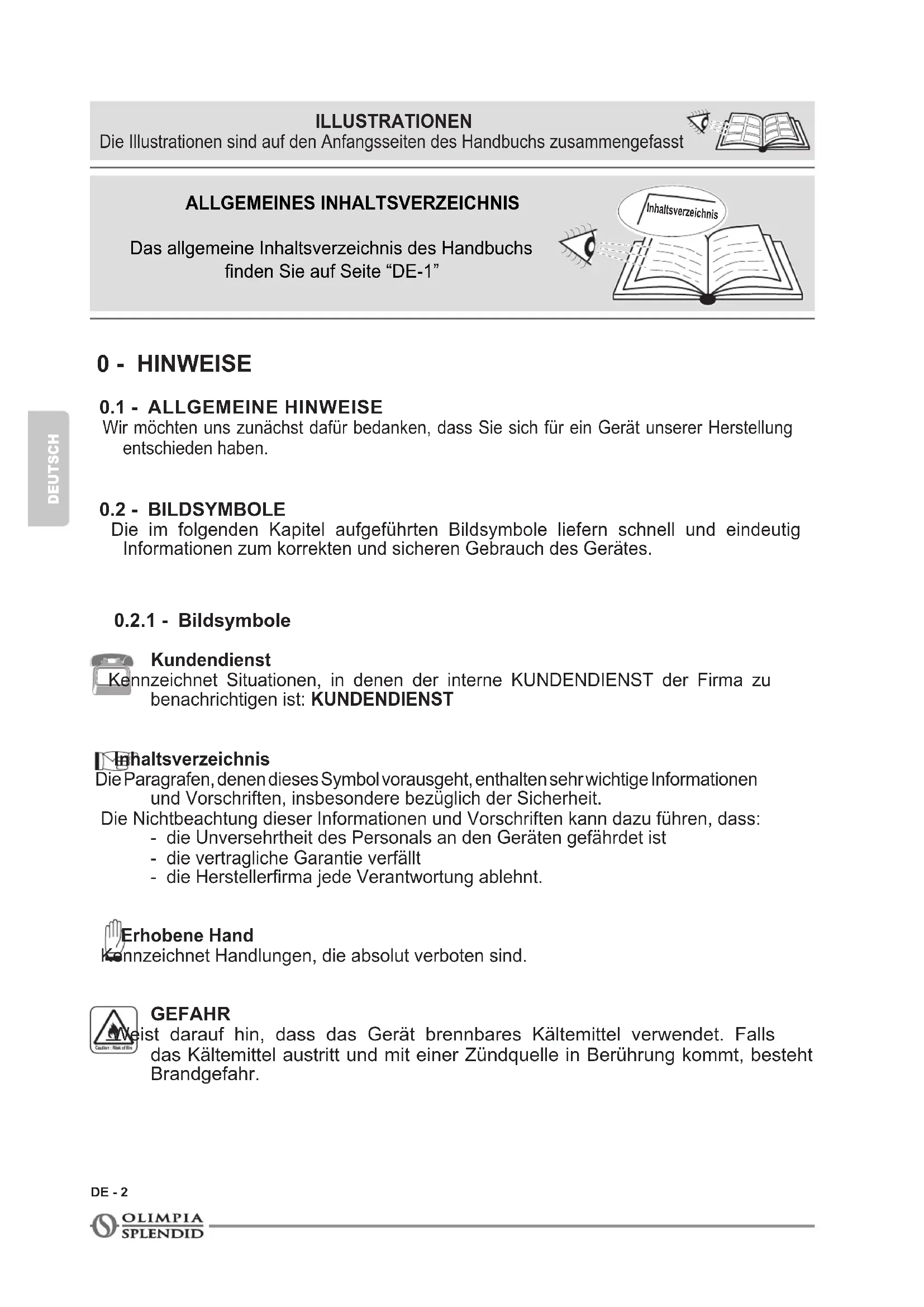 Kundendienst Kennzeichnet Situationen, in denen der interne KUNDENDIENST der Firma zu benachrichtigen ist: KUNDENDIENST Inhaltsverzeichnis Die Paragrafen, denen dieses Symbol vorausgeht, enthalten sehr wichtige Informationen und Vorschriften, insbesondere bezüglich der Sicherheit. Die Nichtbeachtung dieser Informationen und Vorschriften kann dazu führen, dass: - die Unversehrtheit des Personals an den Geräten gefährdet ist - die vertragliche Garantie verfällt - die Herstellerrma jede Verantwortung ablehnt. Erhobene Hand Kennzeichnet Handlungen, die absolut verboten sind. GEFAHR Weist darauf hin, dass das Gerät brennbares Kältemittel verwendet. Falls das Kältemittel austritt und mit einer Zündquelle in Berührung kommt, besteht Brandgefahr. Inhaltsverzeichnis ALLGEMEINES INHALTSVERZEICHNIS Das allgemeine Inhaltsverzeichnis des Handbuchs nden Sie auf Seite “DE-1” ILLUSTRATIONEN Die Illustrationen sind auf den Anfangsseiten des Handbuchs zusammengefasstDOLCECLIMA COMPACT DE - 3 DEUTSCH