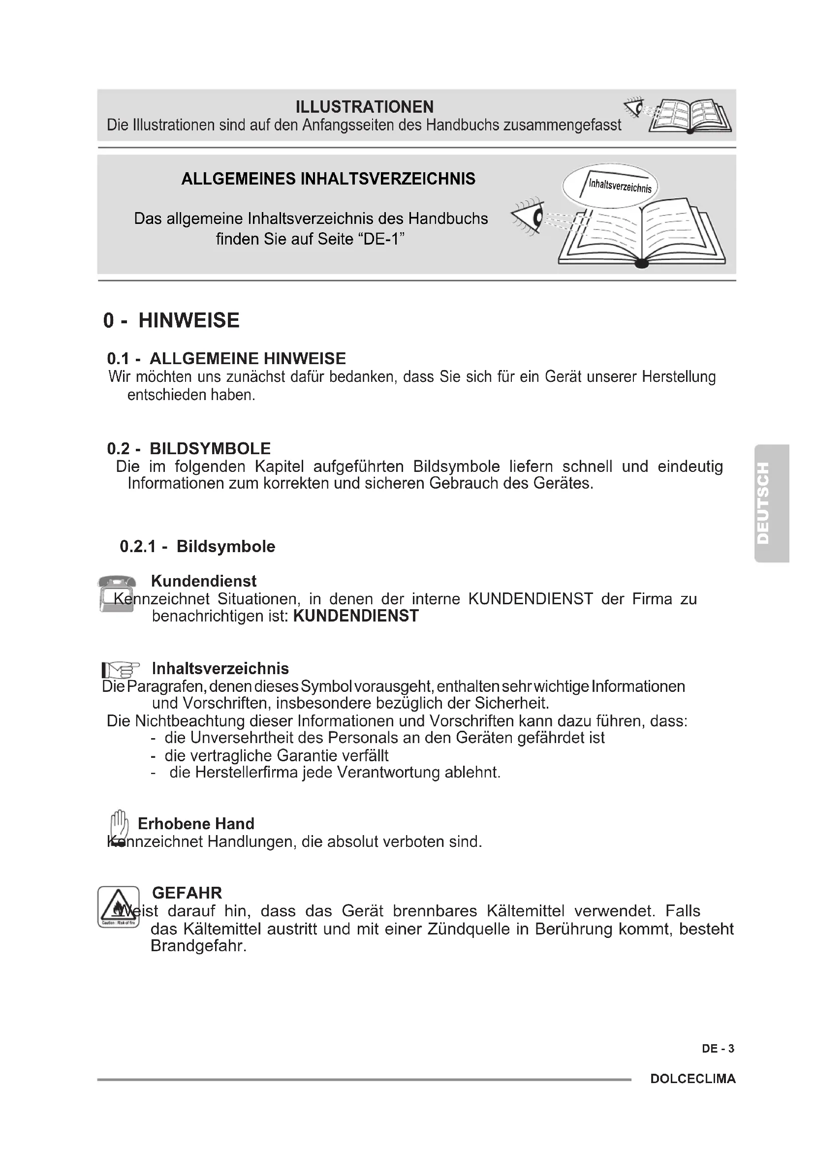 ACHTUNG Zeigt an, dass das Assistenzpersonal beim Umgang des Geräts auf die Anweisungen im Installationshandbuch zu achten hat.DOLCECLIMA DEUTSCH DE - 5