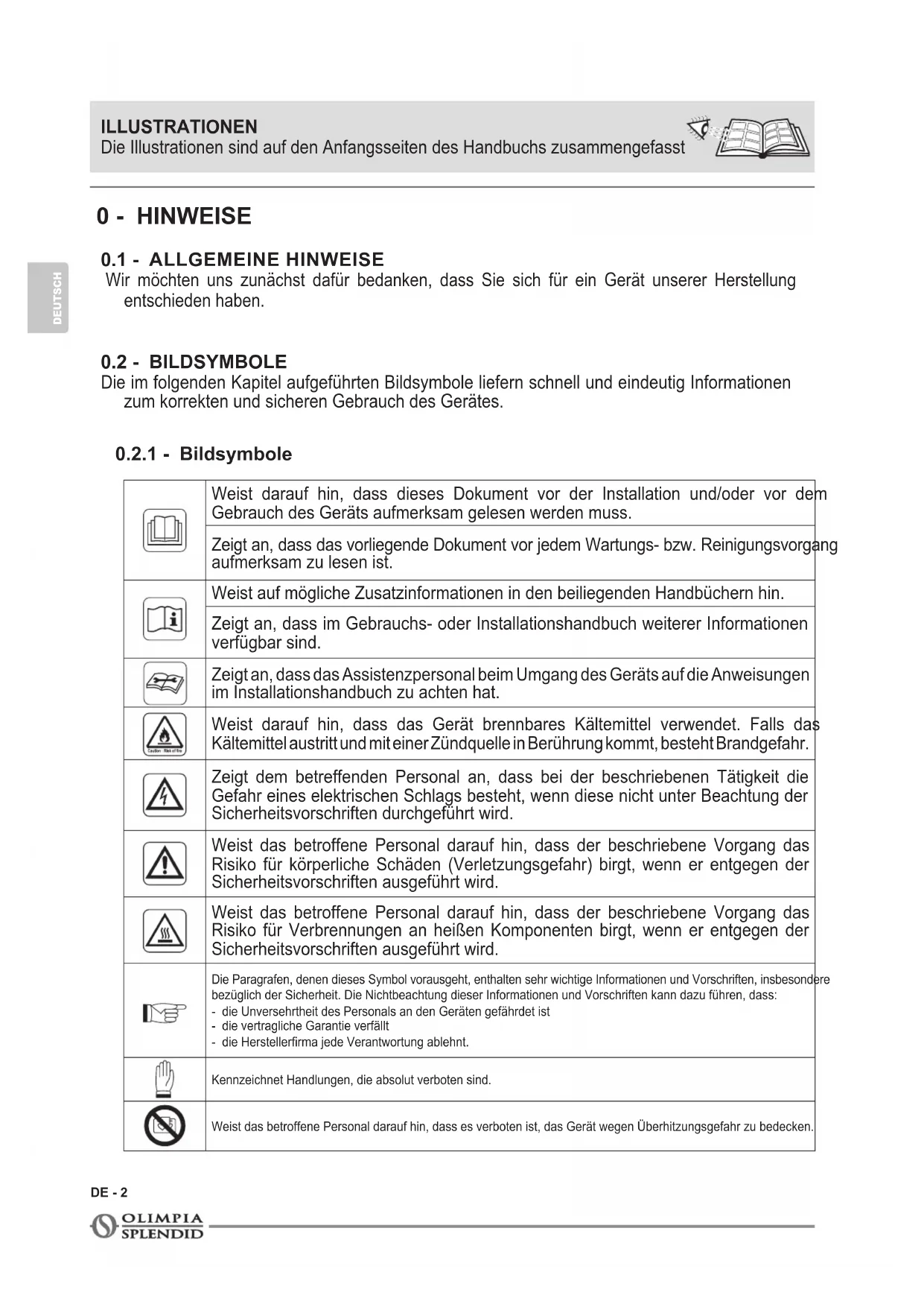 Weist darauf hin, dass dieses Dokument vor der Installation und/oder vor dem Gebrauch des Geräts aufmerksam gelesen werden muss. Zeigt an, dass das vorliegende Dokument vor jedem Wartungs- bzw. Reinigungsvorgang aufmerksam zu lesen ist. Weist auf mögliche Zusatzinformationen in den beiliegenden Handbüchern hin. Zeigt an, dass im Gebrauchs- oder Installationshandbuch weiterer Informationen verfügbar sind. Zeigt an, dass das Assistenzpersonal beim Umgang des Geräts auf die Anweisungen im Installationshandbuch zu achten hat. Weist darauf hin, dass das Gerät brennbares Kältemittel verwendet. Falls das Kältemittel austritt und mit einer Zündquelle in Berührung kommt, besteht Brandgefahr. Zeigt dem betreffenden Personal an, dass bei der beschriebenen Tätigkeit die Gefahr eines elektrischen Schlags besteht, wenn diese nicht unter Beachtung der Sicherheitsvorschriften durchgeführt wird. Weist das betroffene Personal darauf hin, dass der beschriebene Vorgang das Risiko für körperliche Schäden (Verletzungsgefahr) birgt, wenn er entgegen der Sicherheitsvorschriften ausgeführt wird. Weist das betroffene Personal darauf hin, dass der beschriebene Vorgang das Risiko für Verbrennungen an heißen Komponenten birgt, wenn er entgegen der Sicherheitsvorschriften ausgeführt wird. Die Paragrafen, denen dieses Symbol vorausgeht, enthalten sehr wichtige Informationen und Vorschriften, insbesondere bezüglich der Sicherheit. Die Nichtbeachtung dieser Informationen und Vorschriften kann dazu führen, dass:- die Unversehrtheit des Personals an den Geräten gefährdet ist- die vertragliche Garantie verfällt- die Herstellerrma jede Verantwortung ablehnt.Kennzeichnet Handlungen, die absolut verboten sind.Weist das betroffene Personal darauf hin, dass es verboten ist, das Gerät wegen Überhitzungsgefahr zu bedecken. ILLUSTRATIONEN Die Illustrationen sind auf den Anfangsseiten des Handbuchs zusammengefasstDOLCECLIMA AIR PRO DE - 3 DEUTSCH