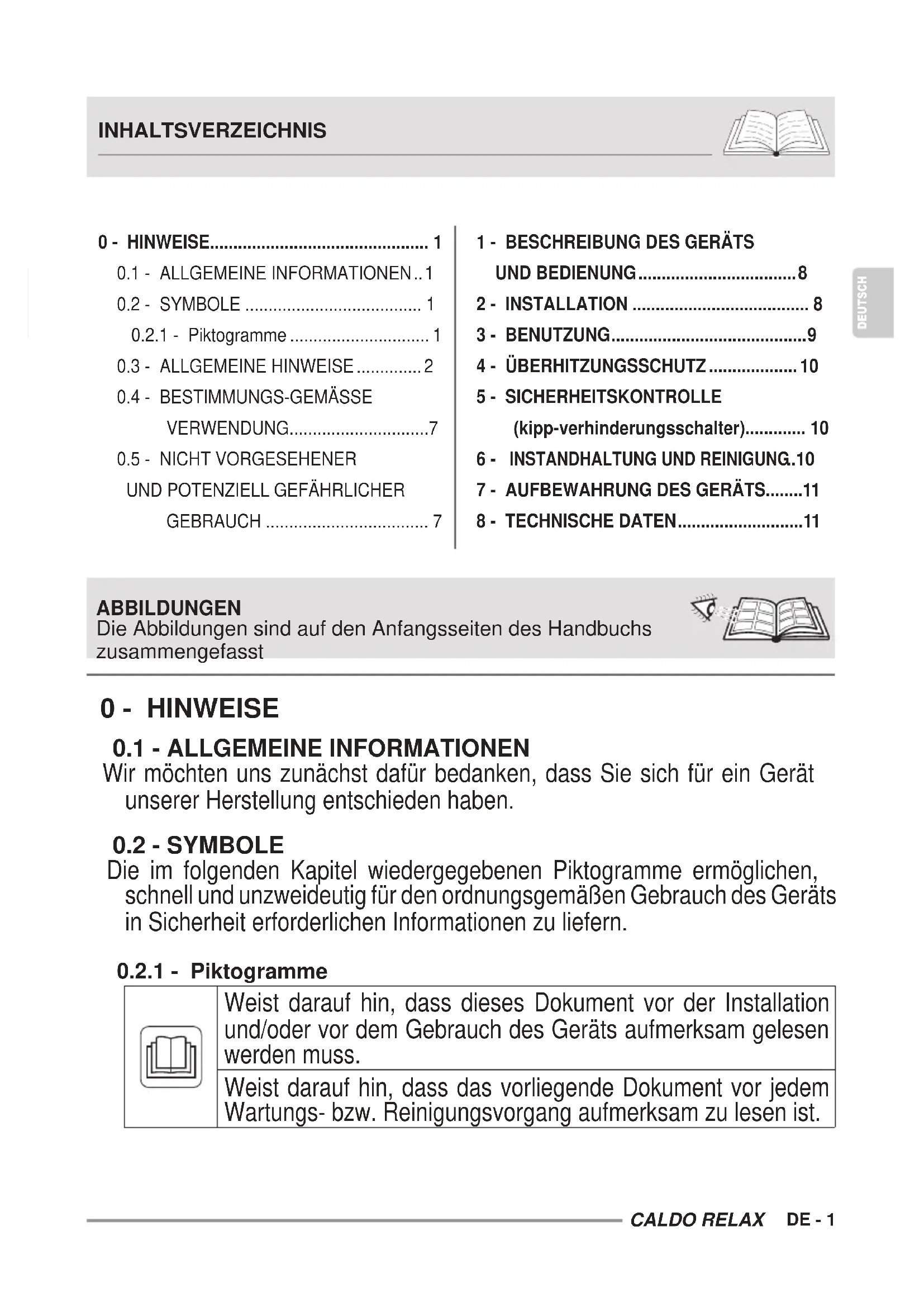 - Weist darauf hin, dass dieses Dokument vor der Installation und/oder vor dem Gebrauch des Geräts aufmerksam gelesen werden muss. Weist darauf hin, dass das vorliegende Dokument vor jedem Wartungs- bzw. Reinigungsvorgang aufmerksam zu lesen ist. ABBILDUNGEN Die Abbildungen sind auf den Anfangsseiten des Handbuchs zusammengefasst 0 - HINWEISE p. 10