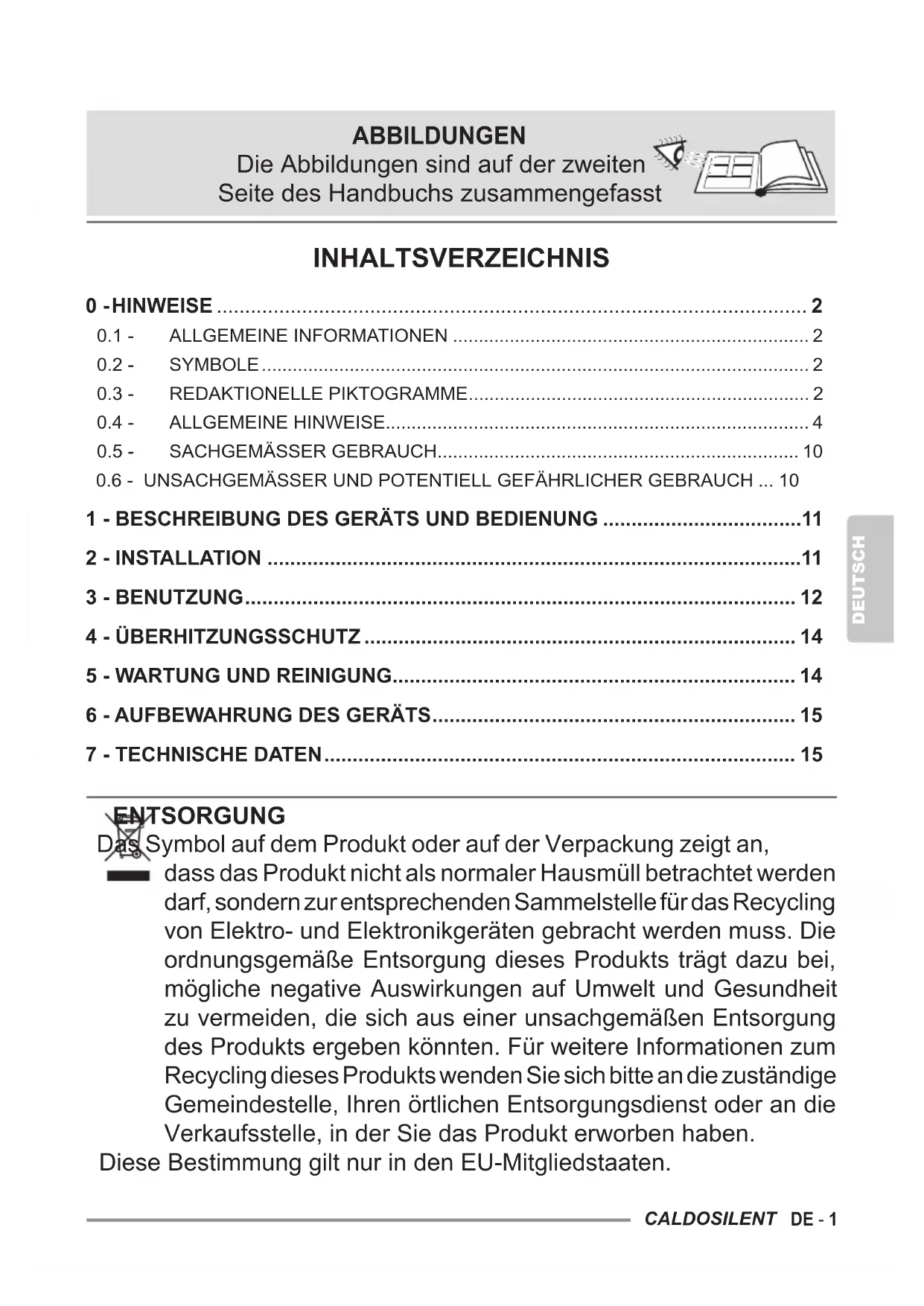 Kabel oder der Stecker beschädigt ist, wenn es heruntergefal- len ist oder in irgendeiner Weise beschädigt wurde. Das Gerät ausschalten, den Stecker aus der Netzsteckdose ziehen und es von Fachpersonal kontrollieren lassen.CALDOSILENT DEUTSCH DE - 9