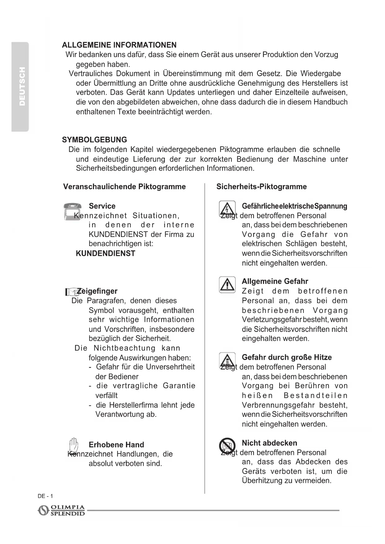 DER HERSTELLER ÜBERNIMMT KEINE HAFTUNG FÜR PERSONEN-ODERSACHSCHÄDEN, DIE DURCH NICTBEACHTUNG DER IN DIESER BETRIEBSANLEITUNG ENTHALTENVORSCHRIFTENENTSTEHEN.