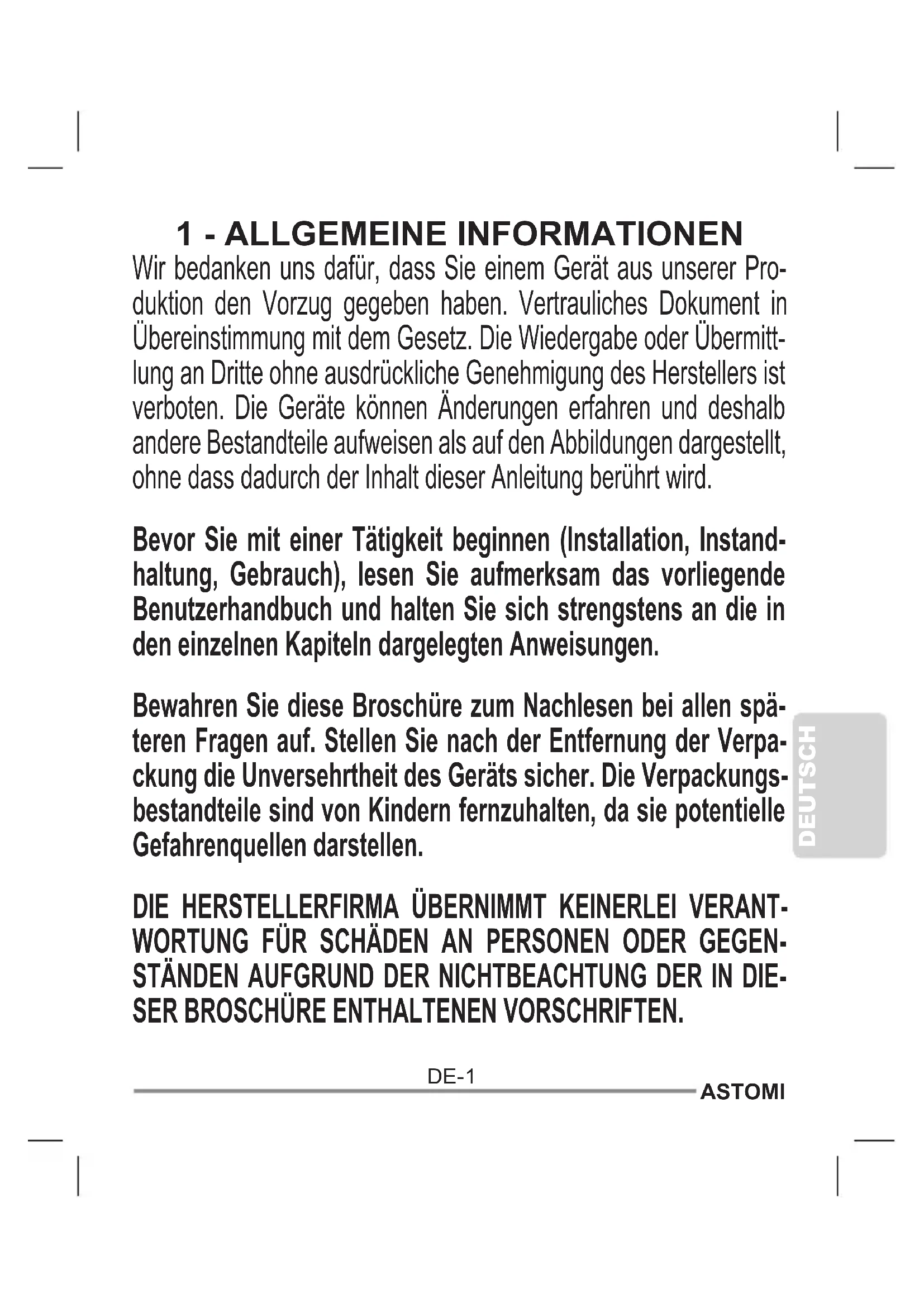 ASTOMIDEUTSCH DE- Die Herstellerrma behält sich das Recht auf jederzeitige Ände- rungen an ihren Modellen vor. Die in diesem Handbuch beschrie- benen grundlegenden Eigenschaften bleiben davon unberührt.