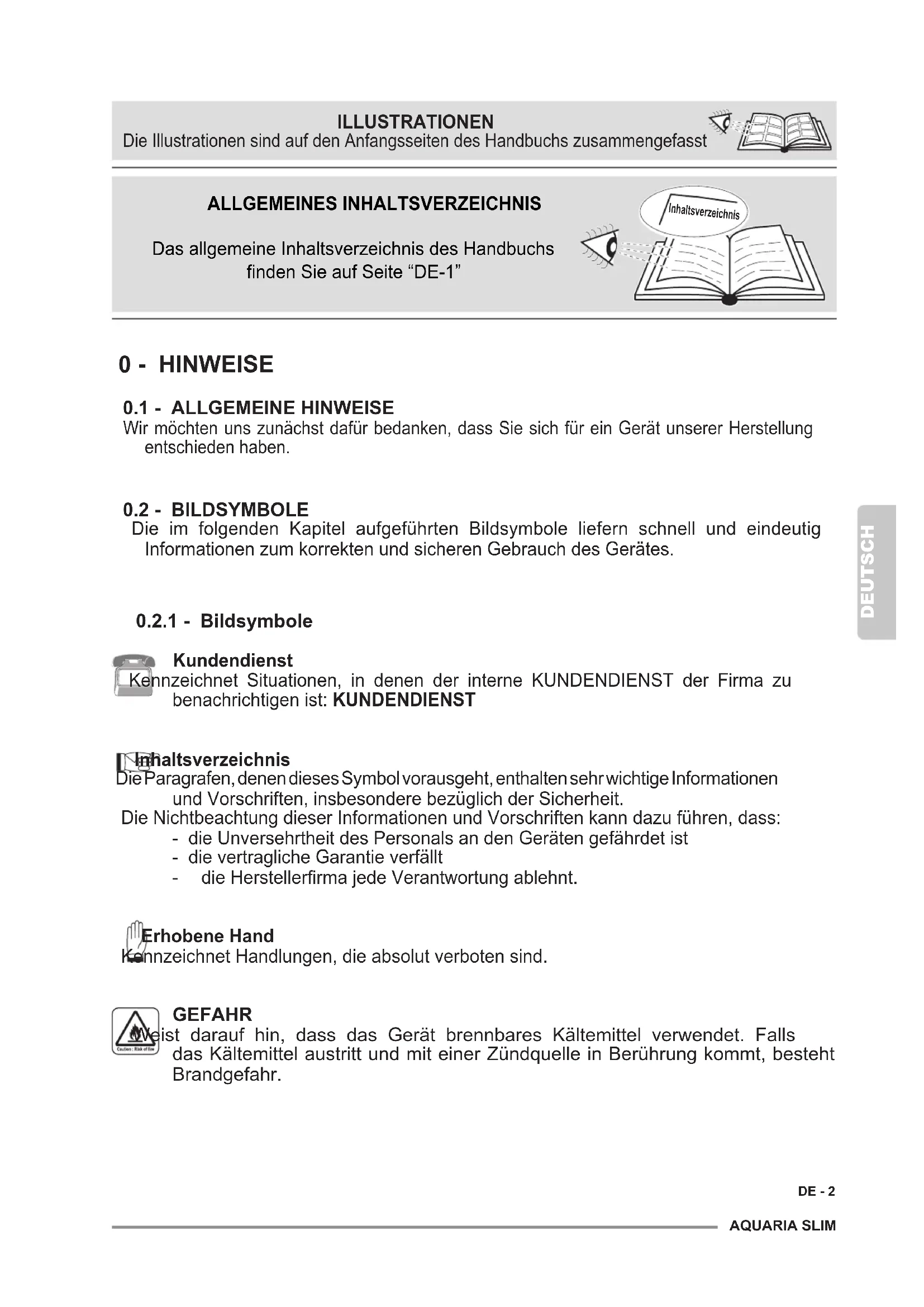 Kundendienst Kennzeichnet Situationen, in denen der interne KUNDENDIENST der Firma zu benachrichtigen ist: KUNDENDIENST Inhaltsverzeichnis Die Paragrafen, denen dieses Symbol vorausgeht, enthalten sehr wichtige Informationen und Vorschriften, insbesondere bezüglich der Sicherheit. Die Nichtbeachtung dieser Informationen und Vorschriften kann dazu führen, dass: - die Unversehrtheit des Personals an den Geräten gefährdet ist - die vertragliche Garantie verfällt - dieHerstellerrmajedeVerantwortungablehnt. Erhobene Hand Kennzeichnet Handlungen, die absolut verboten sind. GEFAHR Weist darauf hin, dass das Gerät brennbares Kältemittel verwendet. Falls das Kältemittel austritt und mit einer Zündquelle in Berührung kommt, besteht Brandgefahr.DEUTSCH DE - 3