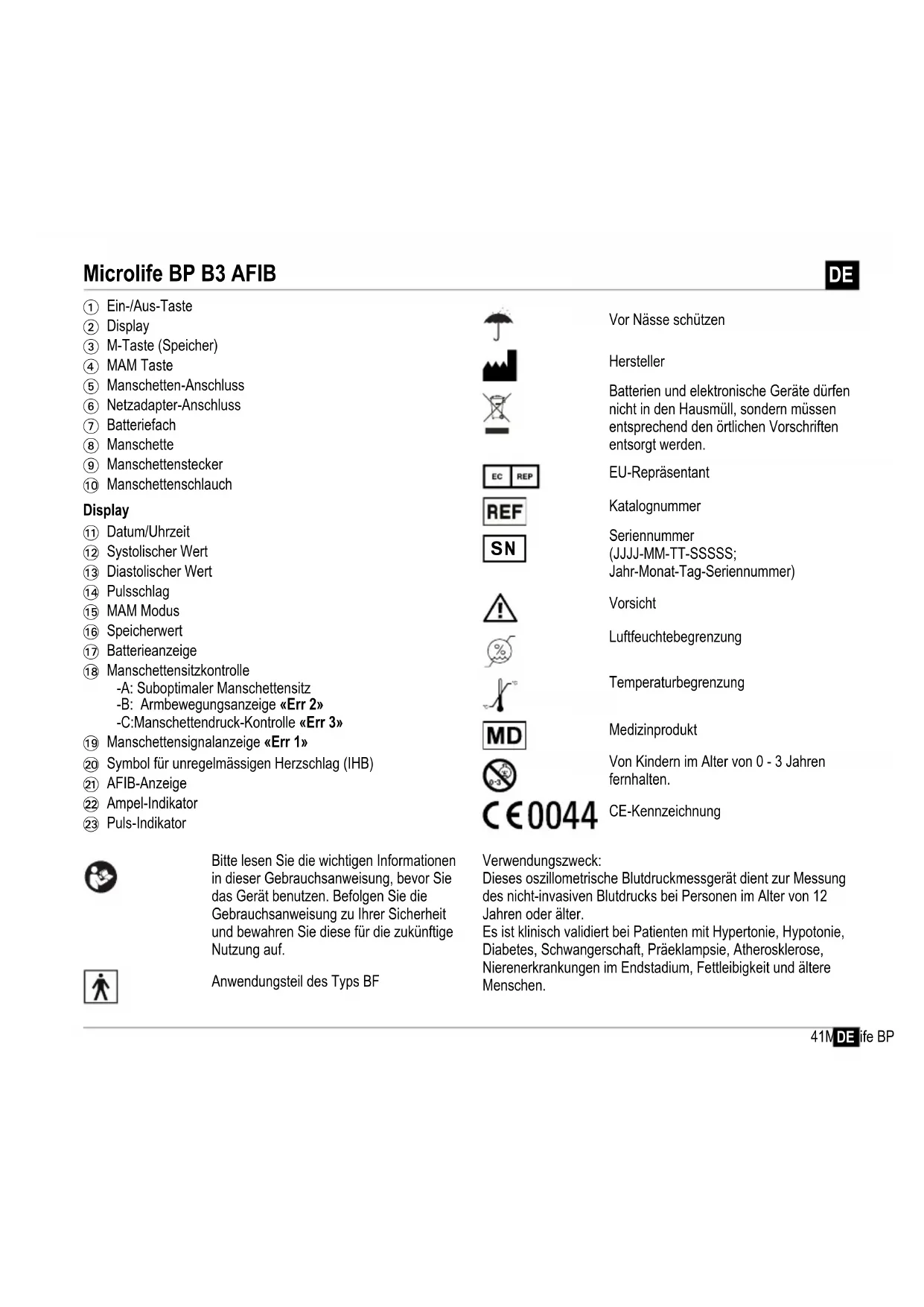 1 Ein-/Aus-Taste 2 Display 3 M-Taste (Speicher) 4 MAM Taste 5 Manschetten-Anschluss 6 Netzadapter-Anschluss 7 Batteriefach 8 Manschette 9 Manschettenstecker AT Manschettenschlauch AK Datum/Uhrzeit AL Systolischer Wert AM Diastolischer Wert AN Pulsschlag AO MAM Modus AP Speicherwert AQ Batterieanzeige AR Manschettensitzkontrolle -A: Suboptimaler Manschettensitz -B: Armbewegungsanzeige «Err 2» -C:Manschettendruck-Kontrolle «Err 3» AS Manschettensignalanzeige «Err 1» BT Symbol für unregelmässigen Herzschlag (IHB) BK AFIB-Anzeige BL Ampel-Indikator BM Puls-Indikator Bitte lesen Sie die wichtigen Informationen in dieser Gebrauchsanweisung, bevor Sie das Gerät benutzen. Befolgen Sie die Gebrauchsanweisung zu Ihrer Sicherheit und bewahren Sie diese für die zukünftige Nutzung auf. Anwendungsteil des Typs BF Vor Nässe schützen Hersteller Batterien und elektronische Geräte dürfen nicht in den Hausmüll, sondern müssen entsprechend den örtlichen Vorschriften entsorgt werden. EU-Repräsentant Katalognummer Seriennummer (JJJJ-MM-TT-SSSSS; Jahr-Monat-Tag-Seriennummer) Vorsicht Luftfeuchtebegrenzung Temperaturbegrenzung Medizinprodukt Von Kindern im Alter von 0 - 3 Jahren fernhalten. CE-Kennzeichnung