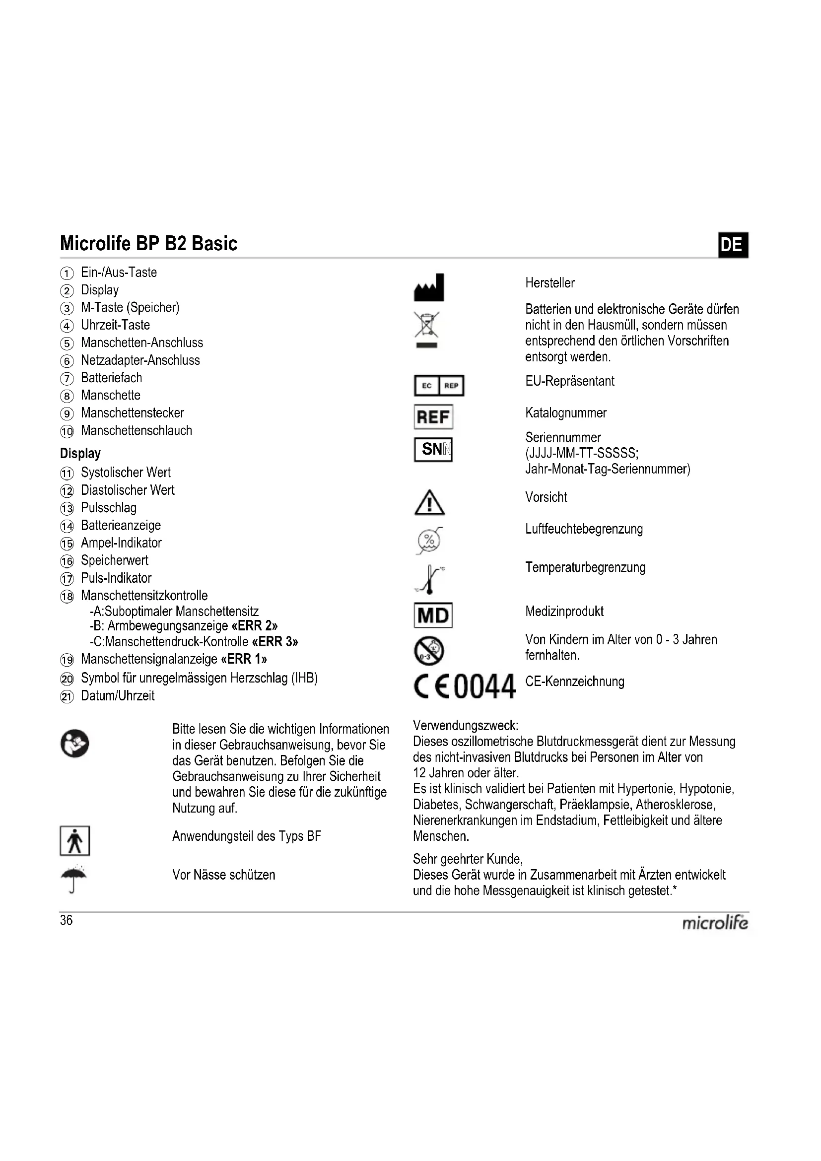 Questo dispositivo è conforme alla direttiva sui prodotti medicali 93/42/EEC. Con riserva di apportare modifiche tecniche. Alimentazione: 4 x batterie alcaline da 1,5 Volt; tipo AA trasformatore DC 6V, 600 mA (optional) Durata batterie: approssim. 920 misurazioni (usando batterie nuove) Classe IP: IP 20 Riferimento agli standard: EN 1060-1 /-3 /-4; IEC 60601-1; IEC 60601-1-2 (EMC); IEC 60601-1-11 Aspettativa di vita del prodotto in uso: Dispositivo: 5 anni o 10000 misurazioni, a seconda di quale condizione si verifica per prima. Accessori: 2 anni o 5000 misurazioni, a seconda di quale condizione si verifica per prima.36 Display Verwendungszweck: Dieses oszillometrische Blutdruckmessgerät dient zur Messung des nicht-invasiven Blutdrucks bei Personen im Alter von 12 Jahren oder älter. Es ist klinisch validiert bei Patienten mit Hypertonie, Hypotonie, Diabetes, Schwangerschaft, Präeklampsie, Atherosklerose, Nierenerkrankungen im Endstadium, Fettleibigkeit und ältere Menschen. Sehr geehrter Kunde, Dieses Gerät wurde in Zusammenarbeit mit Ärzten entwickelt und die hohe Messgenauigkeit ist klinisch getestet.* Microlife BP B2 Basic
