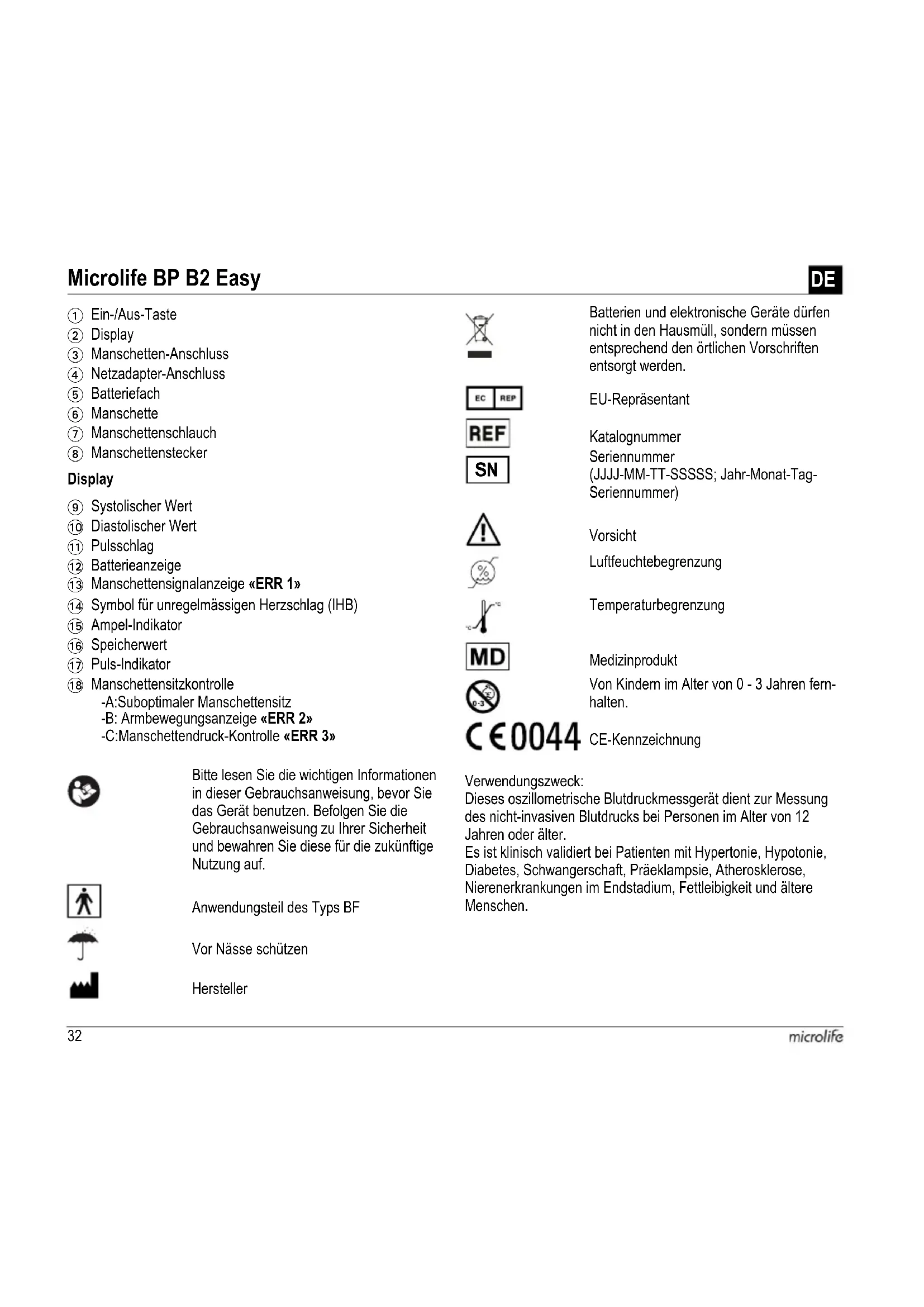 1 Ein-/Aus-Taste 2 Display 3 Manschetten-Anschluss 4 Netzadapter-Anschluss 5 Batteriefach 6 Manschette 7 Manschettenschlauch 8 Manschettenstecker 9 Systolischer Wert AT Diastolischer Wert AK Pulsschlag AL Batterieanzeige AM Manschettensignalanzeige «ERR 1» AN Symbol für unregelmässigen Herzschlag (IHB) AO Ampel-Indikator AP Speicherwert AQ Puls-Indikator AR Manschettensitzkontrolle -A:Suboptimaler Manschettensitz -B: Armbewegungsanzeige «ERR 2» -C:Manschettendruck-Kontrolle «ERR 3» Bitte lesen Sie die wichtigen Informationen in dieser Gebrauchsanweisung, bevor Sie das Gerät benutzen. Befolgen Sie die Gebrauchsanweisung zu Ihrer Sicherheit und bewahren Sie diese für die zukünftige Nutzung auf. Anwendungsteil des Typs BF Vor Nässe schützen Hersteller Batterien und elektronische Geräte dürfen nicht in den Hausmüll, sondern müssen entsprechend den örtlichen Vorschriften entsorgt werden. EU-Repräsentant Katalognummer Seriennummer (JJJJ-MM-TT-SSSSS; Jahr-Monat-Tag- Seriennummer) Vorsicht Luftfeuchtebegrenzung Temperaturbegrenzung Medizinprodukt Von Kindern im Alter von 0 - 3 Jahren fern- halten. CE-Kennzeichnung
