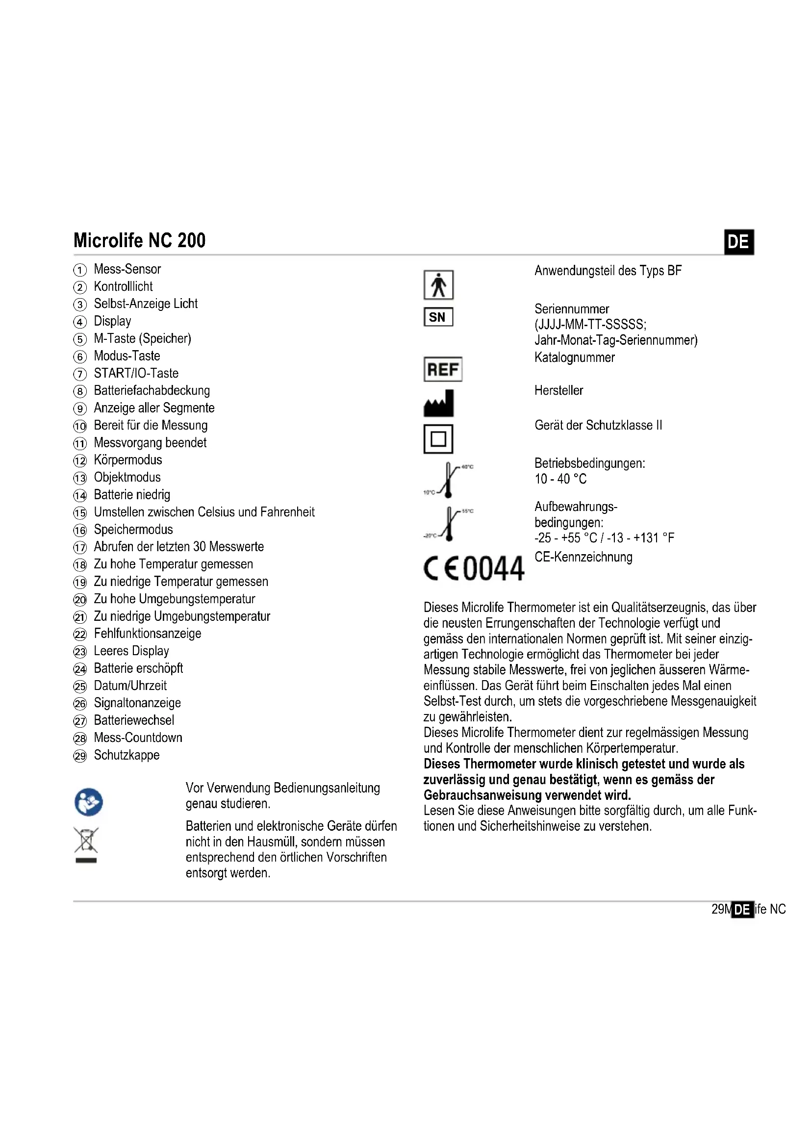 1 Mess-Sensor 2 Kontrolllicht 3 Selbst-Anzeige Licht 4 Display 5 M-Taste (Speicher) 6 Modus-Taste 7 START/IO-Taste 8 Batteriefachabdeckung 9 Anzeige aller Segmente AT Bereit für die Messung AK Messvorgang beendet AL Körpermodus AM Objektmodus AN Batterie niedrig AO Umstellen zwischen Celsius und Fahrenheit AP Speichermodus AQ Abrufen der letzten 30 Messwerte AR Zu hohe Temperatur gemessen AS Zu niedrige Temperatur gemessen BT Zu hohe Umgebungstemperatur BK Zu niedrige Umgebungstemperatur BL Fehlfunktionsanzeige BM Leeres Display BN Batterie erschöpft BO Datum/Uhrzeit BP Signaltonanzeige BQ Batteriewechsel BR Mess-Countdown BS Schutzkappe Vor Verwendung Bedienungsanleitung genau studieren. Batterien und elektronische Geräte dürfen nicht in den Hausmüll, sondern müssen entsprechend den örtlichen Vorschriften entsorgt werden. Anwendungsteil des Typs BF Seriennummer (JJJJ-MM-TT-SSSSS; Jahr-Monat-Tag-Seriennummer) Katalognummer Hersteller Gerät der Schutzklasse II Betriebsbedingungen: