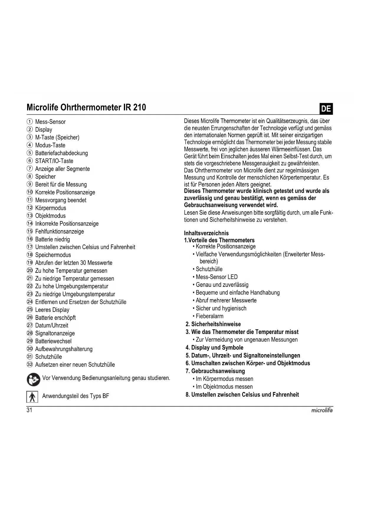 Spegnimento automatico: ca. 1 minuto dall’ultima misurazione. Batteria: 1 x batteria CR2032 3Volt Durata batterie: approssim. 800 misurazioni (usando una batteria nuova) Dimensioni: 159 x 43 x 60 mm Peso: 60 g (con batteria), 58 g (senza batteria) Classe IP: IP22 Riferimento agli standard: EN 12470-5; ASTM E1965;IEC 60601-1; IEC 60601-1-2 (EMC); IEC 60601-1-11 Aspettativa di vita del prodotto in uso: 5 anni o 12000 misurazioni30IR 210 IT31 Vor Verwendung Bedienungsanleitung genau studieren. Anwendungsteil des Typs BF Dieses Microlife Thermometer ist ein Qualitätserzeugnis, das über die neusten Errungenschaften der Technologie verfügt und gemäss den internationalen Normen geprüft ist. Mit seiner einzigartigen Technologie ermöglicht das Thermometer bei jeder Messung stabile Messwerte, frei von jeglichen äusseren Wärmeeinflüssen. Das Gerät führt beim Einschalten jedes Mal einen Selbst-Test durch, um stets die vorgeschriebene Messgenauigkeit zu gewährleisten. Das Ohrthermometer von Microlife dient zur regelmässigen Messung und Kontrolle der menschlichen Körpertemperatur. Es ist für Personen jeden Alters geeignet. Dieses Thermometer wurde klinisch getestet und wurde als zuverlässig und genau bestätigt, wenn es gemäss der Gebrauchsanweisung verwendet wird. Lesen Sie diese Anweisungen bitte sorgfältig durch, um alle Funk- tionen und Sicherheitshinweise zu verstehen. Inhaltsverzeichnis 1.Vorteile des Thermometers