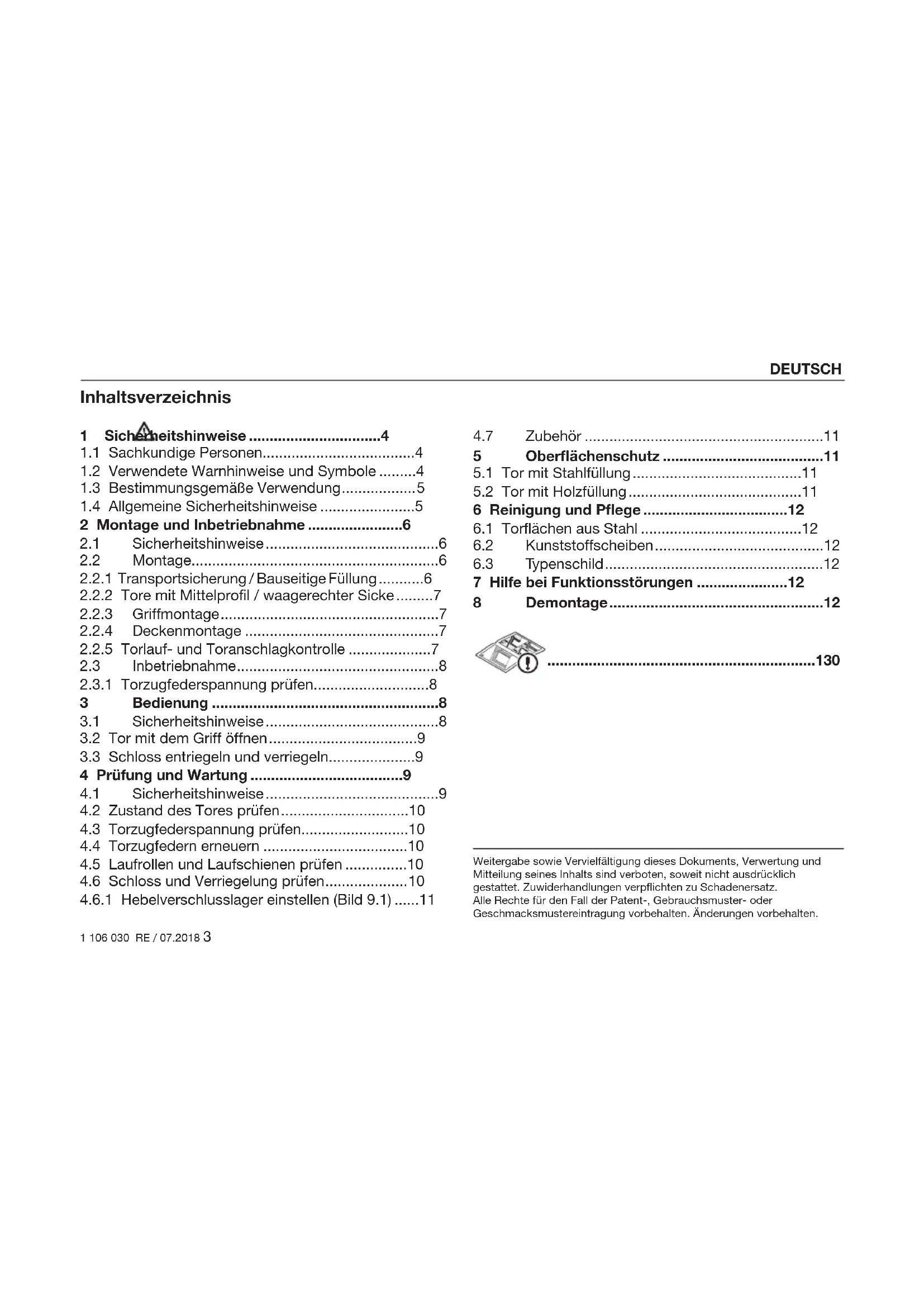 Weitergabe sowie Vervielfältigung dieses Dokuments, Verwertung und Mitteilung seines Inhalts sind verboten, soweit nicht ausdrücklich gestattet. Zuwiderhandlungen verpflichten zu Schadenersatz. Alle Rechte für den Fall der Patent-, Gebrauchsmuster- oder Geschmacksmustereintragung vorbehalten. Änderungen vorbehalten. DEUTSCH4 1 106 030 RE / 07.2018 Sorgen Sie dafür, dass diese Anleitung beim Betreiber des Tores verbleibt! Lesen und beachten Sie diese Anleitung! Sie gibt Ihnen wichtige Informationen zur sicheren Mon- tage, zum Betrieb und für die fachgerechte Pflege und Wartung des Garagentores. Bewahren Sie diese Anleitung und das Garantieheft sorgfältig auf. Tragen Sie die Serien-Nr. (siehe Typenschild) ein. Serien-Nr.: ............................................................ 1 Sicherheitshinweise Schäden, die durch Nichtbeachtung dieser Anlei- tung und der Sicherheitshinweise entstehen, ent- binden den Hersteller von der Haftungspflicht.