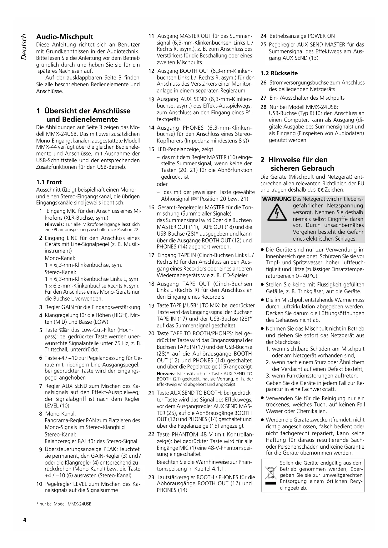 Werden die Geräte zweckentfremdet, nicht richtig angeschlossen, falsch bedient oder nicht fachgerecht repariert, kann keine Haftung für daraus resultierende Sach- oder Personenschäden und keine Garantie für die Geräte übernommen werden. Sollen die Geräte endgültig aus dem Betrieb genommen werden, über-geben Sie sie zur umweltgerechten Entsorgung einem örtlichen Recy-clingbetrieb.* nur bei Modell MMX-24USB5 Deutsch 3 Einsatzmöglichkeiten Dieses Audio-Mischpult ist für universelle Beschallungs- und Aufnahmezwecke geeig-net. Es verfügt über 2 (MMX-24USB) bzw. 4(MMX-44) Mono-Eingangskanäle und 4Ste-reo-Eingangskanäle für den Anschluss von Mikrofonen (auch phantomgespeiste) und Tonquellen mit Line-Ausgangspegel (z. B. In-strumente, Abspielgeräte). Ein Ausspielweg ermöglicht den Einsatz eines Effektgeräts. Außerdem sind Anschlüsse für einen Recorder vorhanden. Die Tonmischung kann über einen Kopfhörer und /oder eine Monitor anlage in einem separaten Regieraum abgehört werden.Das Modell MMX-24USB verfügt zusätzlich über eine USB-Audio-Schnittstelle zur Ver-bindung mit einem Computer. 4 Inbetriebnahme Vor dem Herstellen / Trennen von Verbindun-gen und vor jedem Einschalten sollten die Ausgangsregler BOOTH / PHONES (23) und MASTER (16) auf Minimum gestellt werden.