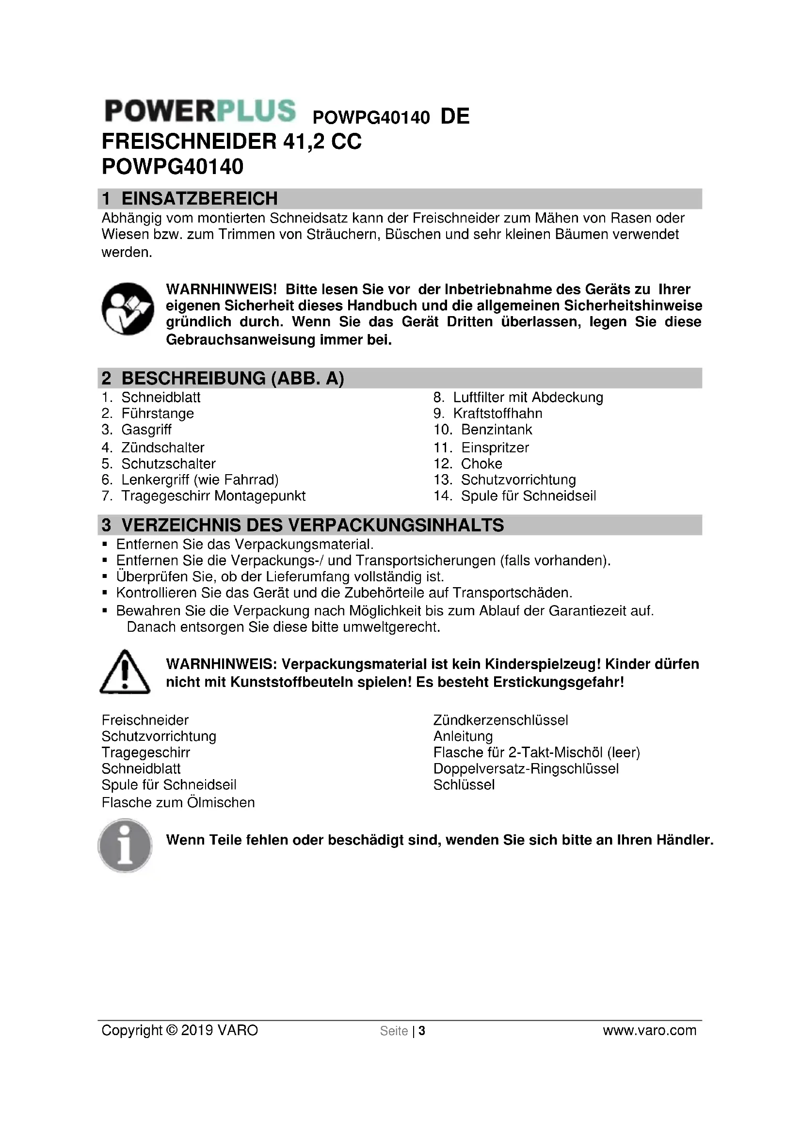 - Bewahren Sie die Verpackung nach Möglichkeit bis zum Ablauf der Garantiezeit auf. Danach entsorgen Sie diese bitte umweltgerecht. WARNHINWEIS: Verpackungsmaterial ist kein Kinderspielzeug! Kinder dürfen nicht mit Kunststoffbeuteln spielen! Es besteht Erstickungsgefahr! Freischneider Schutzvorrichtung Tragegeschirr Schneidblatt Spule für Schneidseil Flasche zum Ölmischen Zündkerzenschlüssel Anleitung Flasche für 2-Takt-Mischöl (leer) Doppelversatz-Ringschlüssel Schlüssel Wenn Teile fehlen oder beschädigt sind, wenden Sie sich bitte an Ihren Händler.POWPG40140 DE Copyright © 2019 VARO Seite | 4 www.varo.com