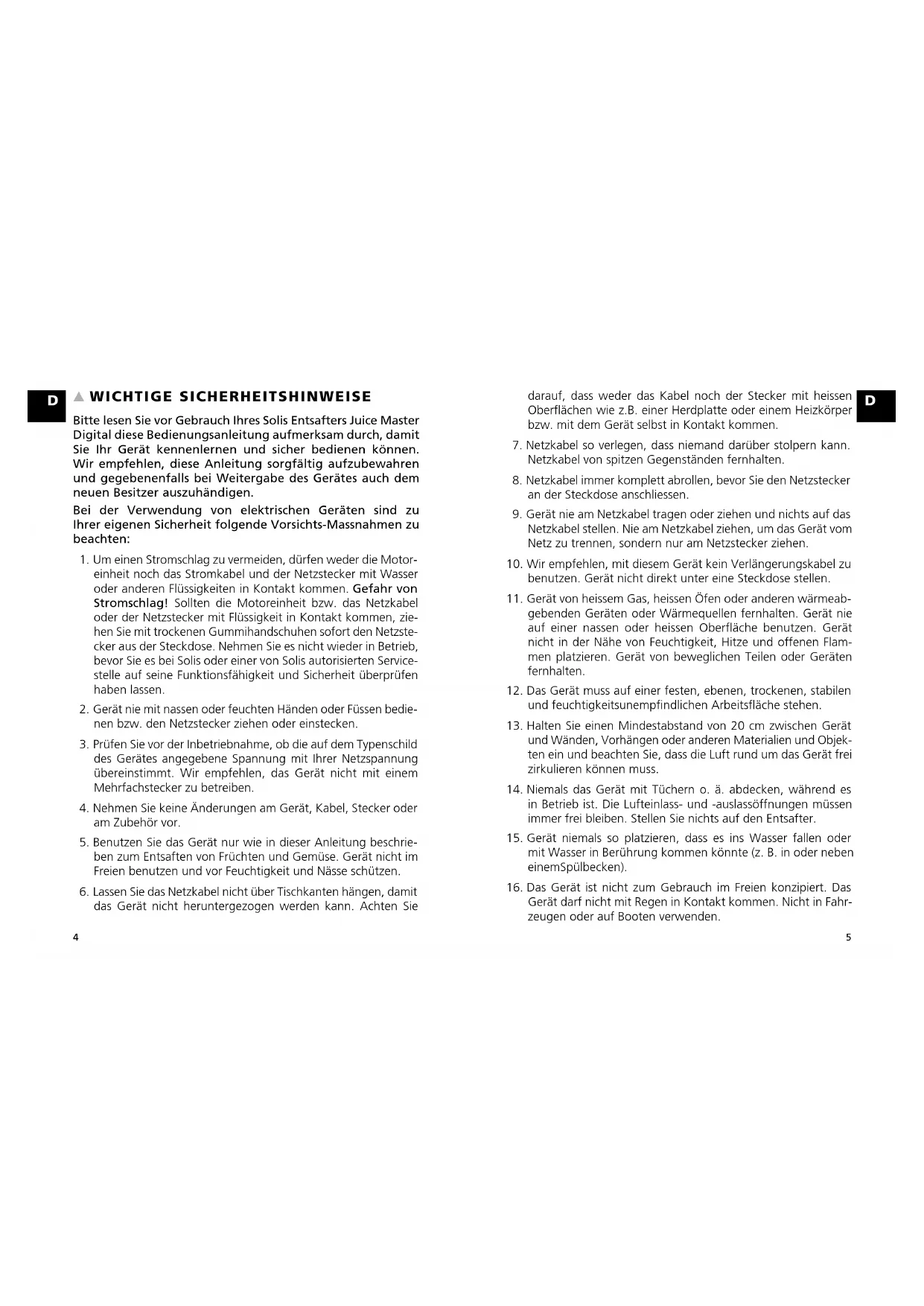 WICHTIGE SICHERHEITSHINWEISE Bitte lesen Sie vor Gebrauch Ihres Solis Entsafters Juice Master Digital diese Bedienungsanleitung aufmerksam durch, damit Sie Ihr Gerät kennenlernen und sicher bedienen können. Wir empfehlen, diese Anleitung sorgfältig aufzubewahren und gegebenenfalls bei Weitergabe des Gerätes auch dem neuen Besitzer auszuhändigen. Bei der Verwendung von elektrischen Geräten sind zu Ihrer eigenen Sicherheit folgende Vorsichts-Massnahmen zu beachten: