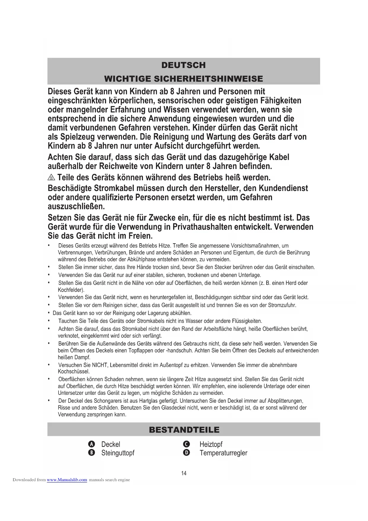 Downloaded from www.Manualslib.com manuals search engine14 DEUTSCH WICHTIGE SICHERHEITSHINWEISE Dieses Gerät kann von Kindern ab 8 Jahren und Personen mit eingeschränkten körperlichen, sensorischen oder geistigen Fähigkeiten oder mangelnder Erfahrung und Wissen verwendet werden, wenn sie entsprechend in die sichere Anwendung eingewiesen wurden und die damit verbundenen Gefahren verstehen. Kinder dürfen das Gerät nicht als Spielzeug verwenden. Die Reinigung und Wartung des Geräts darf von Kindern ab 8 Jahren nur unter Aufsicht durchgeführt werden