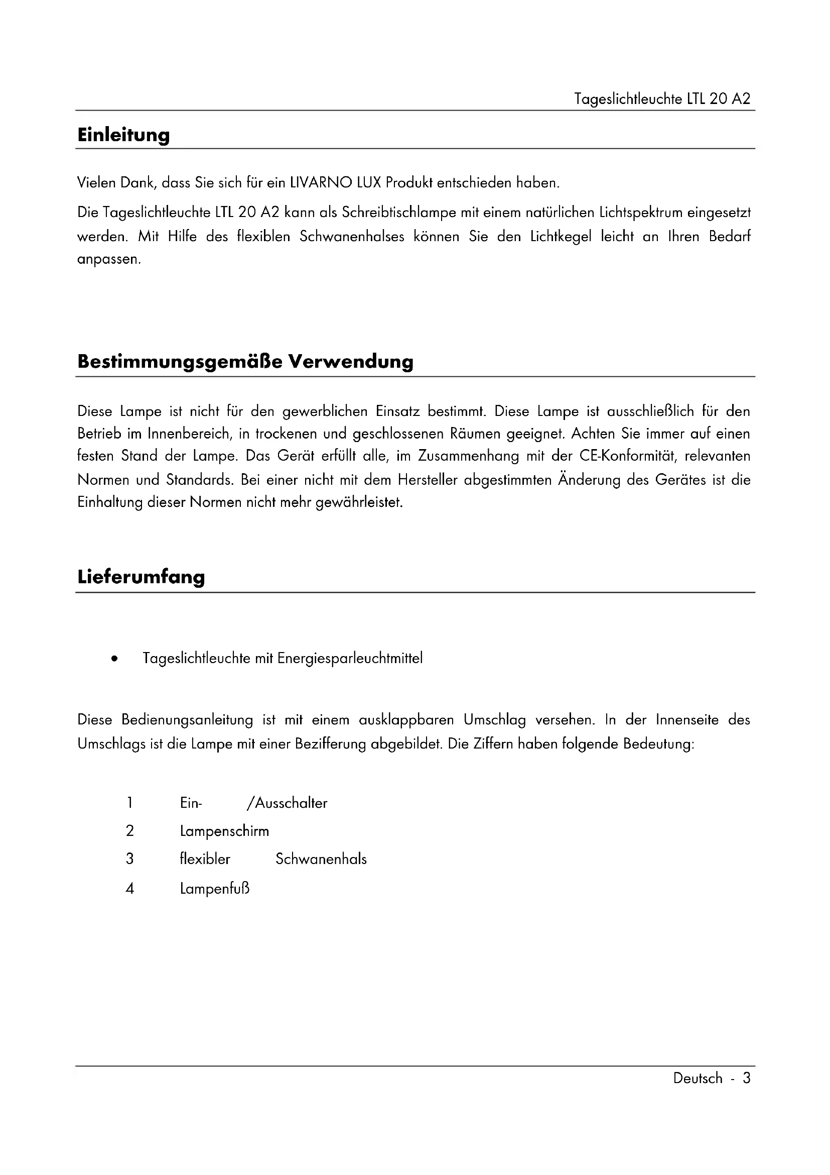 Bestimmungsgemäße Verwendung Diese Lampe ist nicht für den gewerblichen Einsatz bestimmt. Diese Lampe ist ausschließlich für den Betrieb im Innenbereich, in trockenen und geschlossenen Räumen geeignet. Achten Sie immer auf einen festen Stand der Lampe. Das Gerät erfüllt alle, im Zusammenhang mit der CE-Konformität, relevanten Normen und Standards. Bei einer nicht mit dem Hersteller abgestimmten Änderung des Gerätes ist die Einhaltung dieser Normen nicht mehr gewährleistet. Lieferumfang Tageslichtleuchte mit Energiesparleuchtmittel Diese Bedienungsanleitung ist mit einem ausklappbaren Umschlag versehen. In der Innenseite des Umschlags ist die Lampe mit einer Bezifferung abgebildet. Die Ziffern haben folgende Bedeutung: 1 Ein- /Ausschalter 2 Lampenschirm 3 flexibler Schwanenhals 4 LampenfußTageslichtleuchte LTL 20 A2