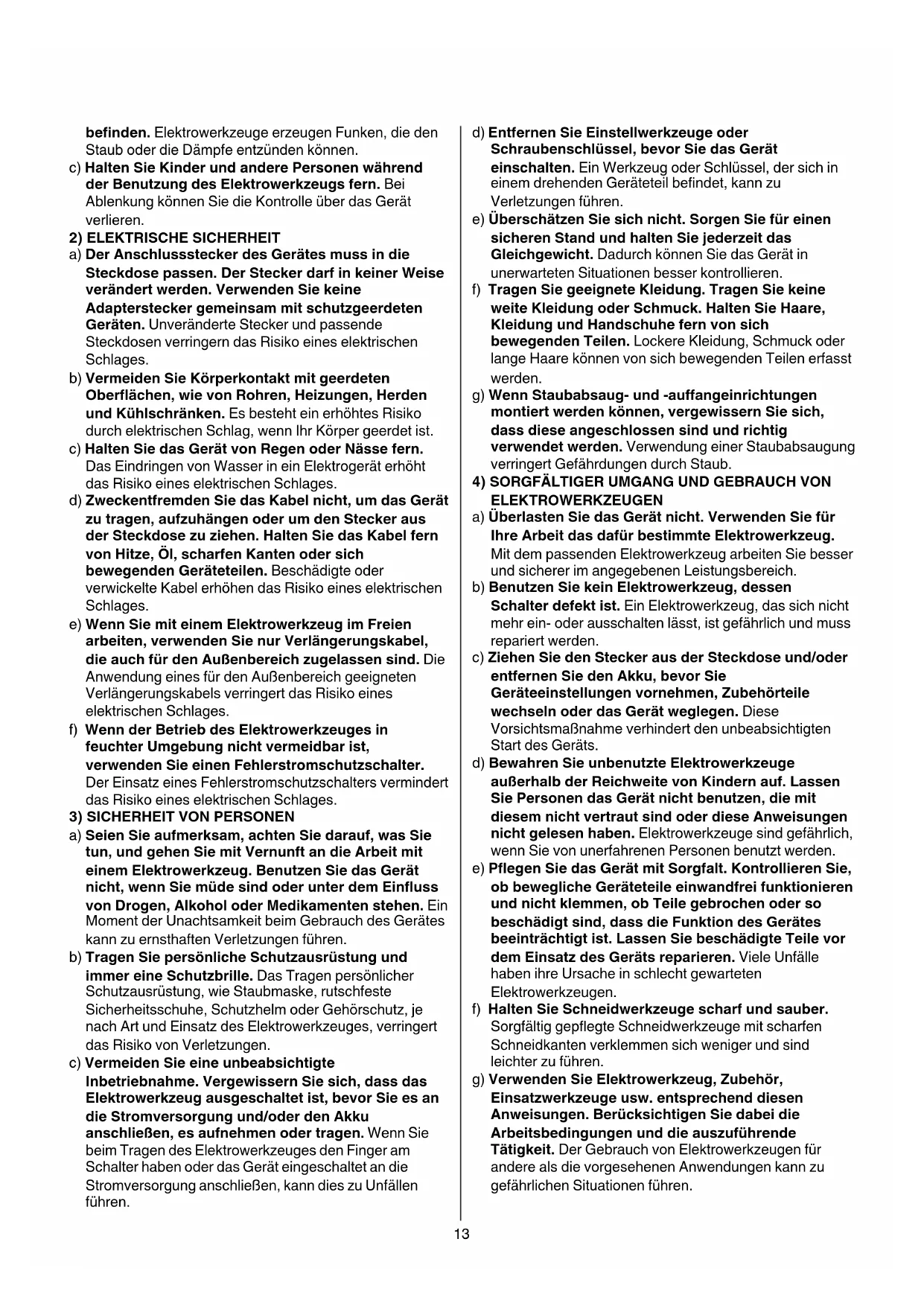 g) Verwenden Sie Elektrowerkzeug, Zubehör, Einsatzwerkzeuge usw. entsprechend diesen Anweisungen. Berücksichtigten Sie darauf die Arbeitsbedingungen und die auszuführende Tätigkeit. Der Gebrauch von Elektrowerkzeugen für andere als die vorgesehenen Anwendungen kann zu gefährlichen Situationen führen.