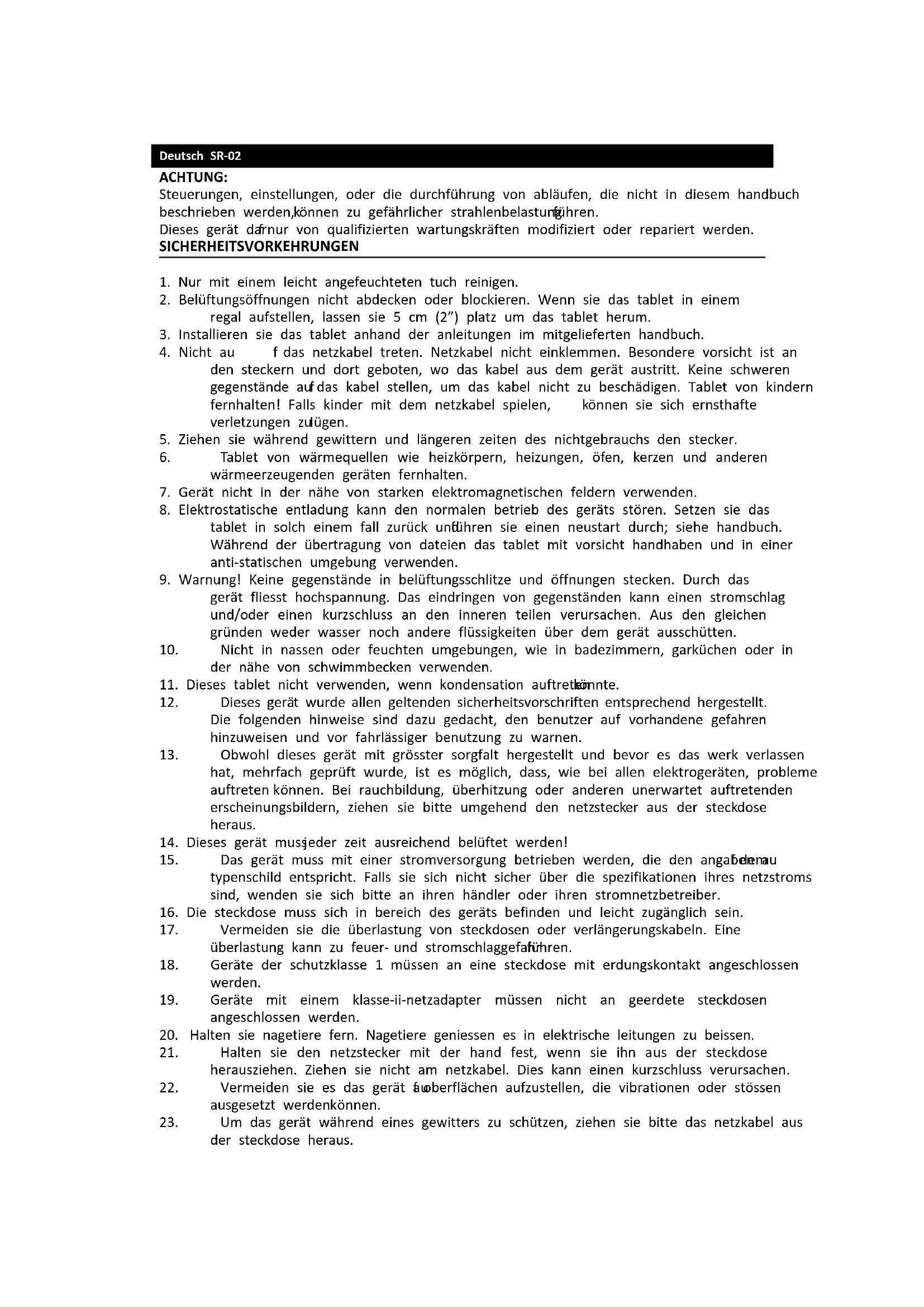 23. Um das gerät während eines gewitters zu schützen, ziehen sie bitte das netzkabel aus