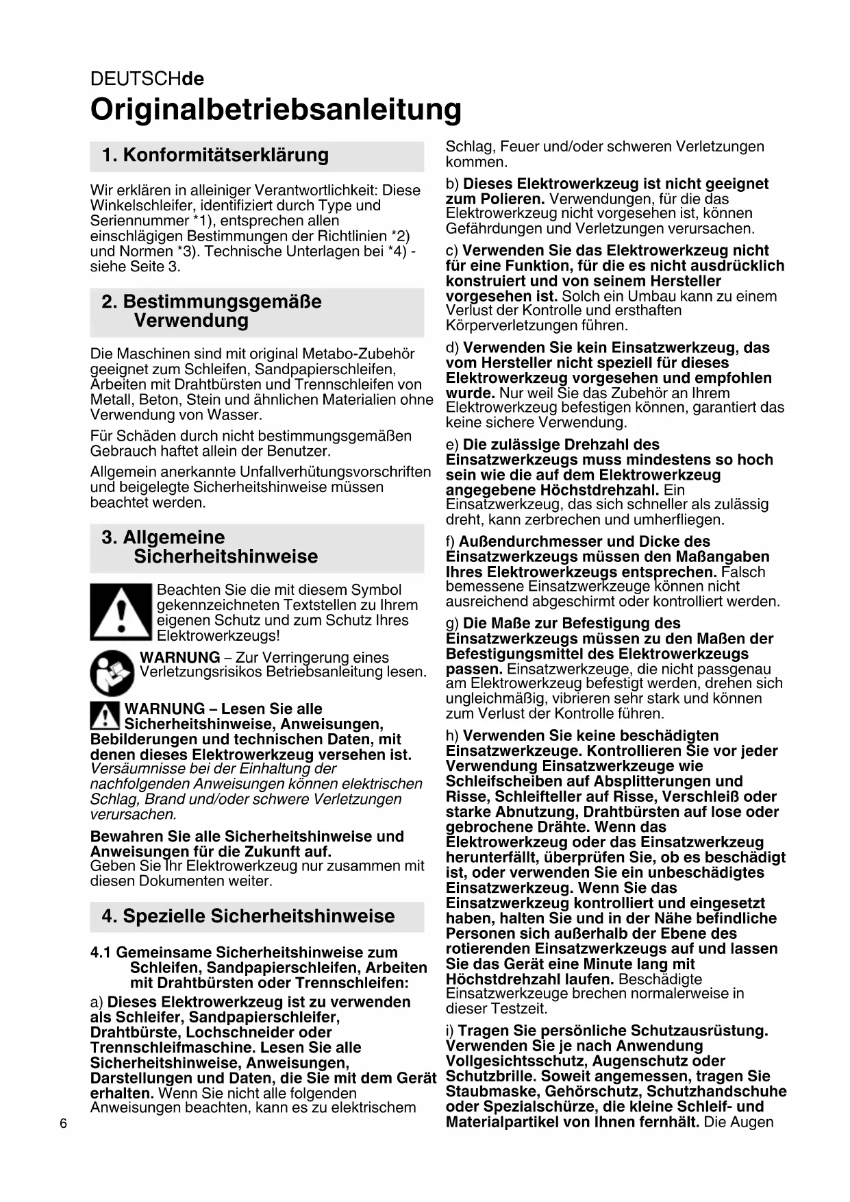 Originalbetriebsanleitung Wir erklären in alleiniger Verantwortlichkeit: Diese Winkelschleifer, identifiziert durch Type und Seriennummer *1), entsprechen allen einschlägigen Bestimmungen der Richtlinien *2) und Normen *3). Technische Unterlagen bei *4) - siehe Seite 3. Die Maschinen sind mit original Metabo-Zubehör geeignet zum Schleifen, Sandpapierschleifen, Arbeiten mit Drahtbürsten und Trennschleifen von Metall, Beton, Stein und ähnlichen Materialien ohne Verwendung von Wasser. Für Schäden durch nicht bestimmungsgemäßen Gebrauch haftet allein der Benutzer. Allgemein anerkannte Unfallverhütungsvorschriften und beigelegte Sicherheitshinweise müssen beachtet werden. Beachten Sie die mit diesem Symbol gekennzeichneten Textstellen zu Ihrem eigenen Schutz und zum Schutz Ihres Elektrowerkzeugs! WARNUNG – Zur Verringerung eines Verletzungsrisikos Betriebsanleitung lesen. WARNUNG – Lesen Sie alle Sicherheitshinweise, Anweisungen, Bebilderungen und technischen Daten, mit denen dieses Elektrowerkzeug versehen ist. Versäumnisse bei der Einhaltung der nachfolgenden Anweisungen können elektrischen Schlag, Brand und/oder schwere Verletzungen verursachen. Bewahren Sie alle Sicherheitshinweise und Anweisungen für die Zukunft auf. Geben Sie Ihr Elektrowerkzeug nur zusammen mit diesen Dokumenten weiter.