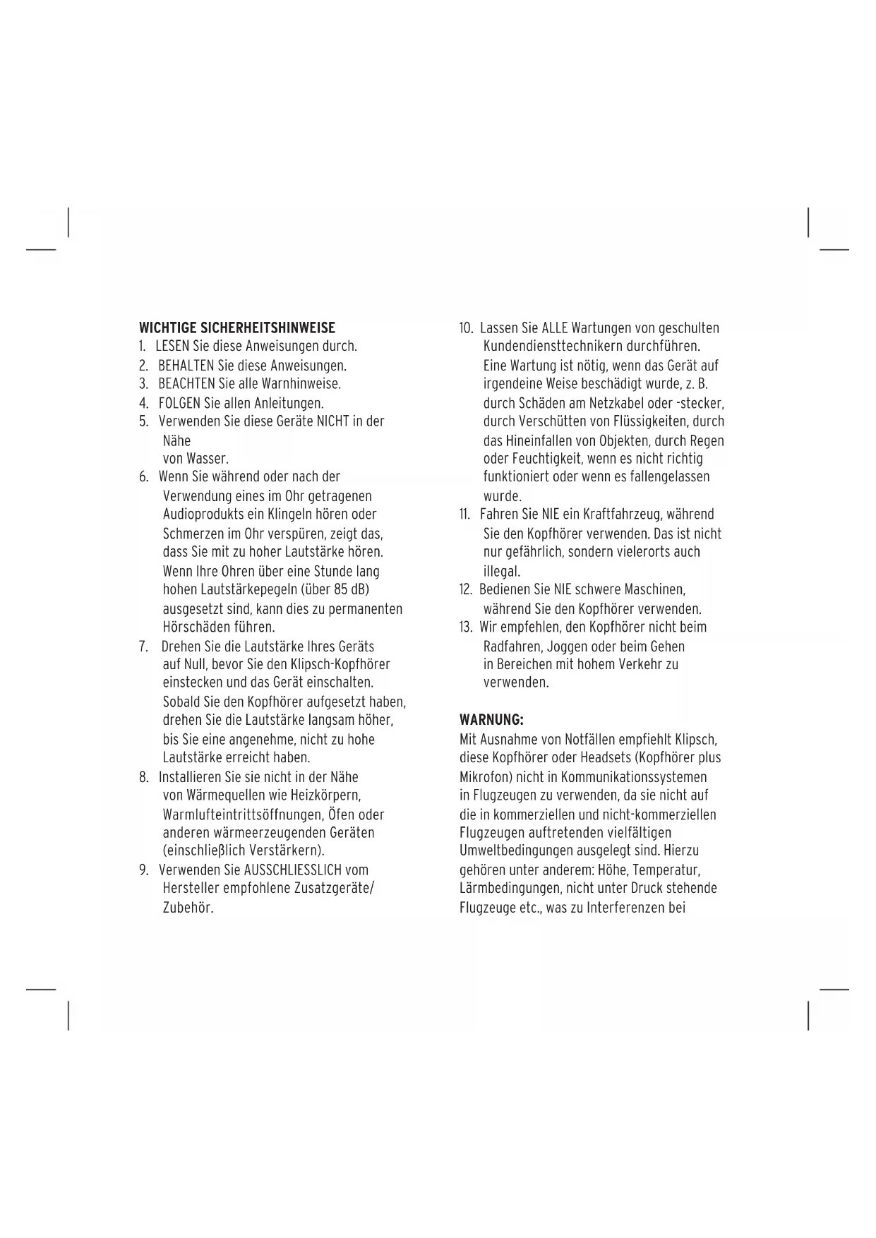 Radfahren, Joggen oder beim Gehen in Bereichen mit hohem Verkehr zu verwenden. WARNUNG: Mit Ausnahme von Notfällen empfiehlt Klipsch, diese Kopfhörer oder Headsets (Kopfhörer plus Mikrofon) nicht in Kommunikationssystemen in Flugzeugen zu verwenden, da sie nicht auf die in kommerziellen und nicht-kommerziellen Flugzeugen auftretenden vielfältigen Umweltbedingungen ausgelegt sind. Hierzu gehören unter anderem: Höhe, Temperatur, Lärmbedingungen, nicht unter Druck stehende Flugzeuge etc., was zu Interferenzen beiwichtigen Meldungen führen kann. Die US-Behörde Occupational Safety Health Administration (OSHA) hat Richtlinien bezüglich der täglichen Verwendungszeiten und der Schalldruckpegel (in Dezibel – dB) bei der Nutzung von Kopfhörern herausgegeben. Ein Dezibel ist eine Lautstärkemaßeinheit, und die Einheiten nehmen bei steigender Lautstärke exponentiell zu. Beispielsweise ist ein typisches Gespräch etwa 60 dB laut, ein Rock-Konzert in einem Stadium hingegen oft um die 110 dB.