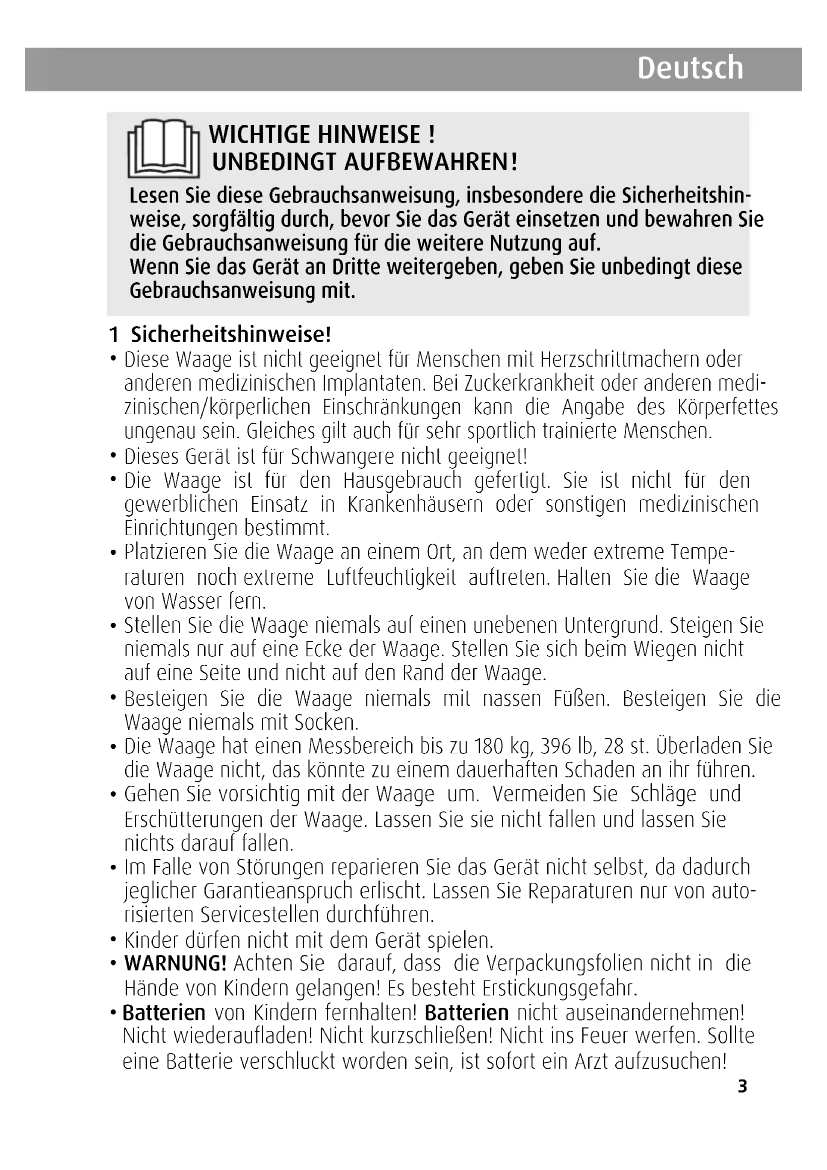 • Die Waage ist für den Hausgebrauch gefertigt. Sie ist nicht für den gewerblichen Einsatz in Krankenhäusern oder sonstigen medizinischen Einrichtungen bestimmt.