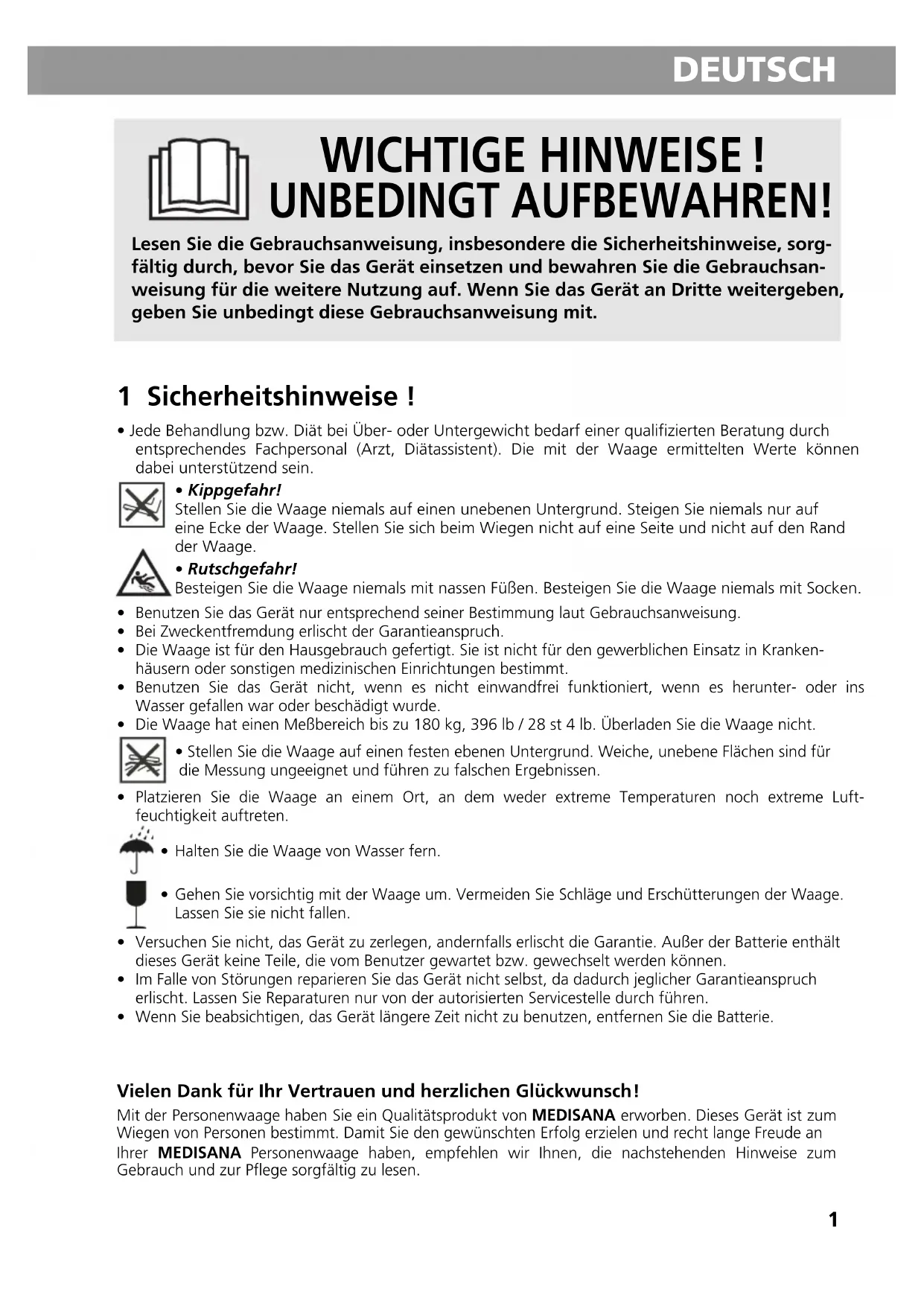 - Jede Behandlung bzw. Diät bei Über- oder Untergewicht bedarf einer qualifizierten Beratung durchentsprechendes Fachpersonal (Arzt, Diätassistent). Die mit der Waage ermittelten Werte könnendabei unterstützend sein.• Kippgefahr!Stellen Sie die Waage niemals auf einen unebenen Untergrund. Steigen Sie niemals nur aufeine Ecke der Waage. Stellen Sie sich beim Wiegen nicht auf eine Seite und nicht auf den Randder Waage.• Rutschgefahr!Besteigen Sie die Waage niemals mit nassen Füßen. Besteigen Sie die Waage niemals mit Socken. Benutzen Sie das Gerät nur entsprechend seiner Bestimmung laut Gebrauchsanweisung. Bei Zweckentfremdung erlischt der Garantieanspruch. Die Waage ist für den Hausgebrauch gefertigt. Sie ist nicht für den gewerblichen Einsatz in Kranken-häusern oder sonstigen medizinischen Einrichtungen bestimmt. Benutzen Sie das Gerät nicht, wenn es nicht einwandfrei funktioniert, wenn es herunter- oder insWasser gefallen war oder beschädigt wurde. Die Waage hat einen Meßbereich bis zu 180 kg, 396 lb / 28 st 4 lb. Überladen Sie die Waage nicht. Stellen Sie die Waage auf einen festen ebenen Untergrund. Weiche, unebene Flächen sind fürdie Messung ungeeignet und führen zu falschen Ergebnissen. Platzieren Sie die Waage an einem Ort, an dem weder extreme Temperaturen noch extreme Luft-feuchtigkeit auftreten. Halten Sie die Waage von Wasser fern. Gehen Sie vorsichtig mit der Waage um. Vermeiden Sie Schläge und Erschütterungen der Waage.Lassen Sie sie nicht fallen. Versuchen Sie nicht, das Gerät zu zerlegen, andernfalls erlischt die Garantie. Außer der Batterie enthältdieses Gerät keine Teile, die vom Benutzer gewartet bzw. gewechselt werden können. Im Falle von Störungen reparieren Sie das Gerät nicht selbst, da dadurch jeglicher Garantieansprucherlischt. Lassen Sie Reparaturen nur von der autorisierten Servicestelle durch führen. Wenn Sie beabsichtigen, das Gerät längere Zeit nicht zu benutzen, entfernen Sie die Batterie. Vielen Dank für Ihr Vertrauen und herzlichen Glückwunsch! Mit der Personenwaage haben Sie ein Qualitätsprodukt von MEDISANA erworben. Dieses Gerät ist zum Wiegen von Personen bestimmt. Damit Sie den gewünschten Erfolg erzielen und recht lange Freude an Ihrer MEDISANA Personenwaage haben, empfehlen wir Ihnen, die nachstehenden Hinweise zum Gebrauch und zur Pflege sorgfältig zu lesen.22 DEUTSCH 2 Lieferumfang und Verpackung Bitte prüfen Sie zunächst, ob das Gerät vollständig ist und keinerlei Beschädigung aufweist. Im Zweifelsfalle nehmen Sie das Gerät nicht in Betrieb und wenden Sie sich an Ihren Händler oder an Ihre Servicestelle. Zum Lieferumfang gehören: