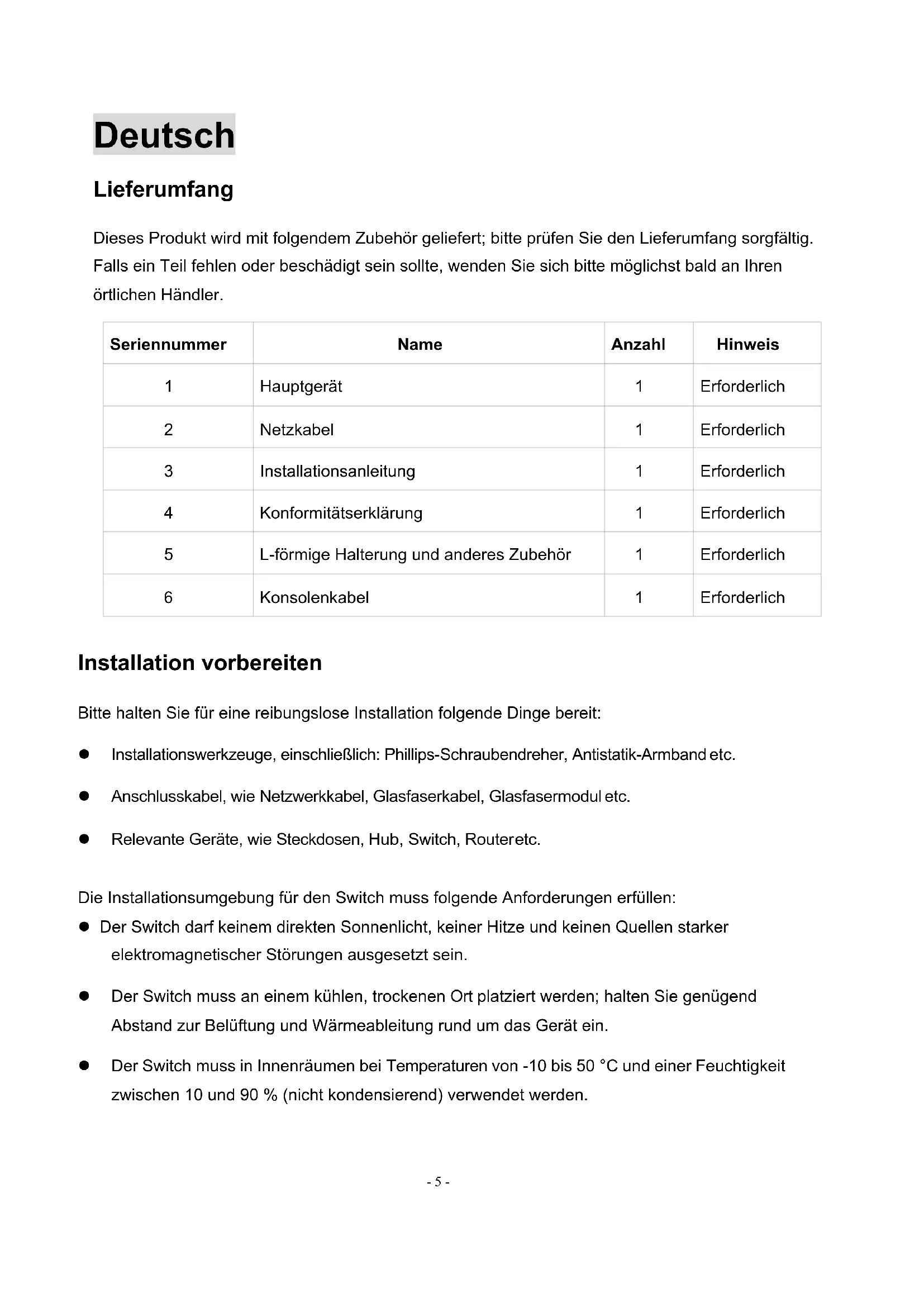 Installation vorbereiten Bitte halten Sie für eine reibungslose Installation folgende Dinge bereit: l Installationswerkzeuge, einschließlich: Phillips-Schraubendreher, Antistatik-Armband etc. l Anschlusskabel, wie Netzwerkkabel, Glasfaserkabel, Glasfasermodul etc. l Relevante Geräte, wie Steckdosen, Hub, Switch, Router etc. Die Installationsumgebung für den Switch muss folgende Anforderungen erfüllen: l Der Switch darf keinem direkten Sonnenlicht, keiner Hitze und keinen Quellen starker elektromagnetischer Störungen ausgesetzt sein. l Der Switch muss an einem kühlen, trockenen Ort platziert werden; halten Sie genügend Abstand zur Belüftung und Wärmeableitung rund um das Gerät ein. l Der Switch muss in Innenräumen bei Temperaturen von -10 bis 50 °C und einer Feuchtigkeit zwischen 10 und 90 % (nicht kondensierend) verwendet werden.- 6 -