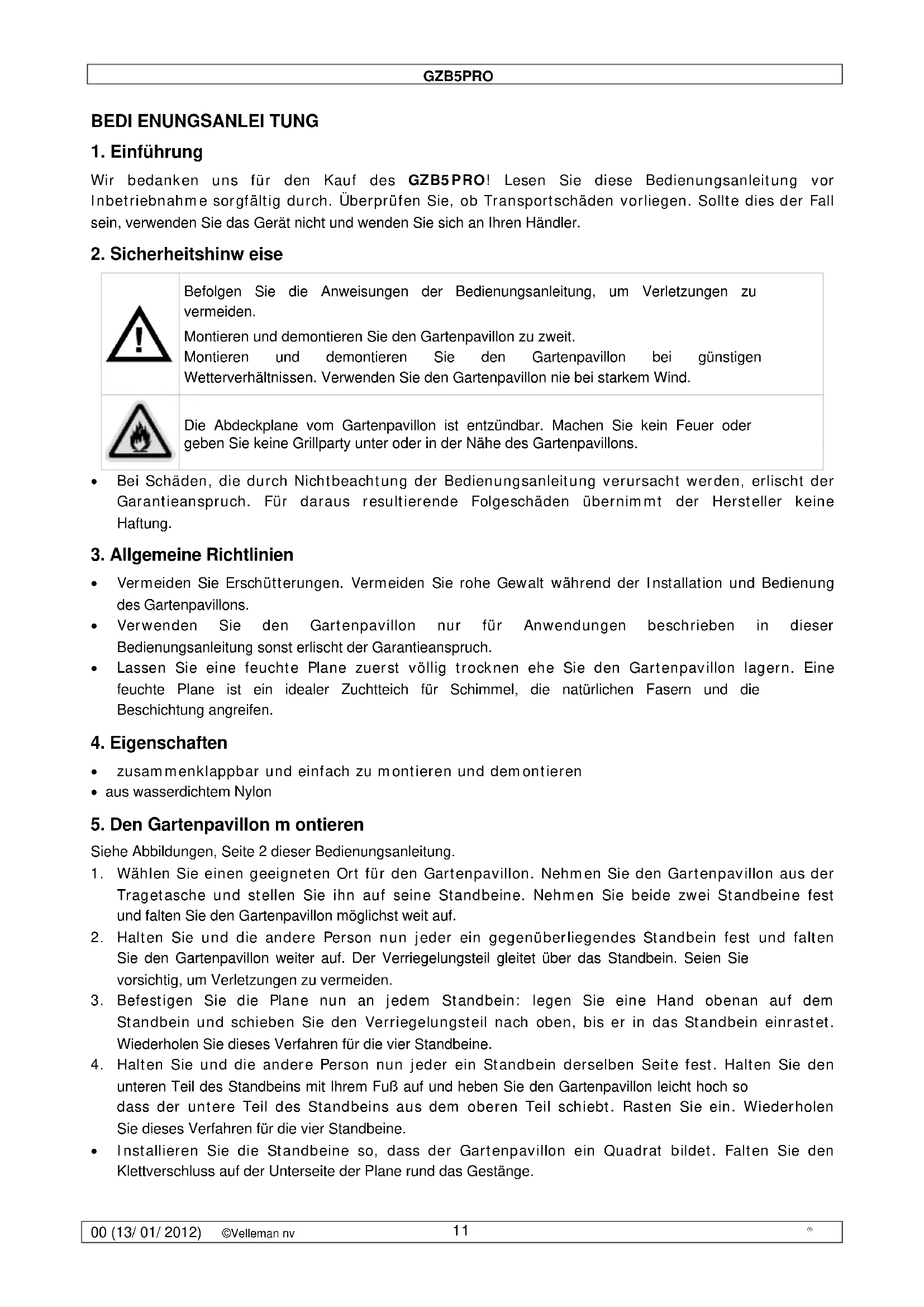 Perel GZB5PRO - Zelt VELLEMAN - Kostenlose Bedienungsanleitung