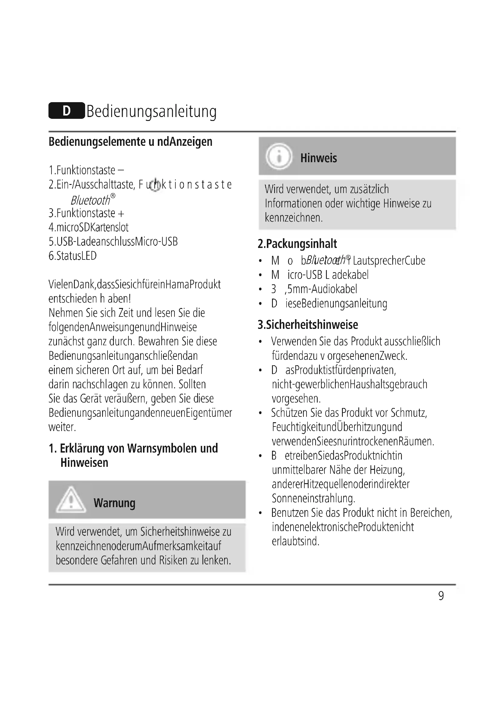 Vielen Dank, dass Sie sich für ein Hama Produkt entschiedenhaben! Nehmen SiesichZeitund lesen Siedie folgenden Anweisungen und Hinweise zunächstganzdurch. Bewahren Sie diese Bedienungsanleitung anschließend an einem sicheren Ortauf ,umbei Bedarf darinnachschlagen zu können. Sollten Sie dasGerät veräußern, geben Siediese Bedienungsanleitung an den neuen Eigentümer weiter. 1.Erklärungvon Warnsymbolen und Hinweisen Warnung Wird verwendet,umSicherheitshinweisezu kennzeichnen oder um Aufmerksamkeit auf besondereGefahren und Risikenzulenken. Hinweis Wird verwendet,umzusätzlich Informationen oderwichtigeHinweise zu kennzeichnen.