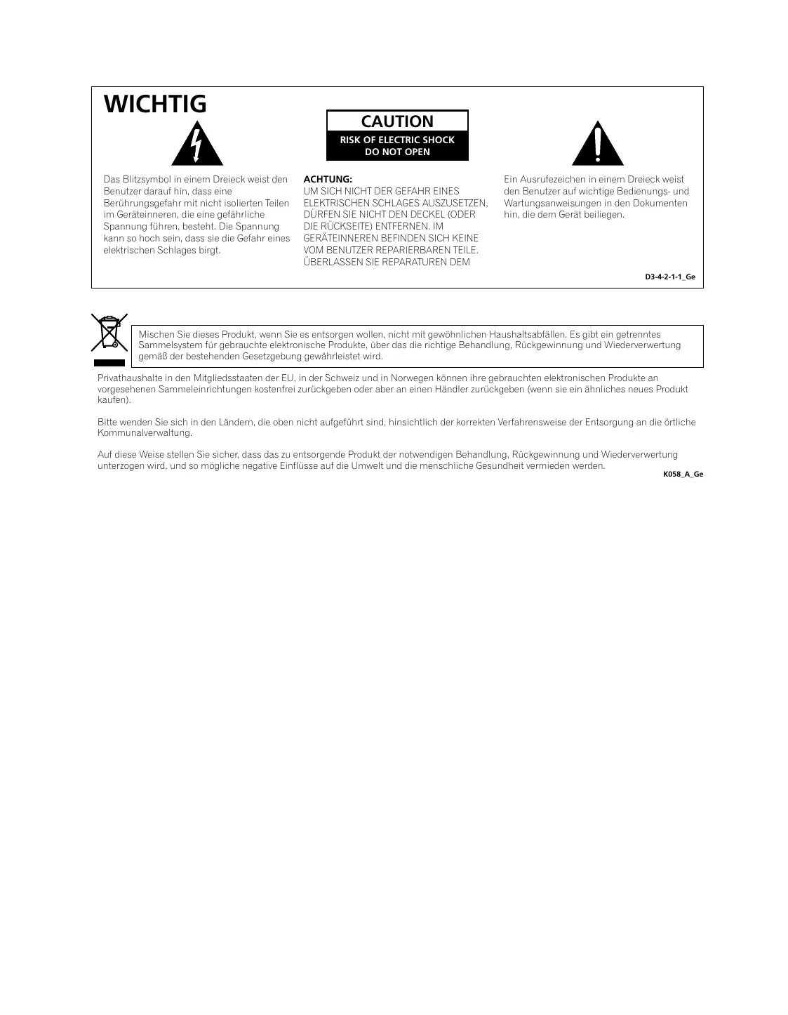 ACHTUNG: UM SICH NICHT DER GEFAHR EINES ELEKTRISCHEN SCHLAGES AUSZUSETZEN, DÜRFEN SIE NICHT DEN DECKEL (ODER DIE RÜCKSEITE) ENTFERNEN. IM GERÄTEINNEREN BEFINDEN SICH KEINE VOM BENUTZER REPARIERBAREN TEILE.