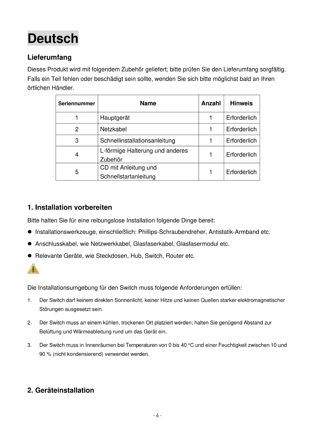 Bitte halten Sie für eine reibungslose Installation folgende Dinge bereit: Installationswerkzeuge, einschließlich: Phillips-Schraubendreher, Antistatik-Armband etc. Anschlusskabel, wie Netzwerkkabel, Glasfaserkabel, Glasfasermodul etc. Relevante Geräte, wie Steckdosen, Hub, Switch, Router etc. Die Installationsumgebung für den Switch muss folgende Anforderungen erfüllen: