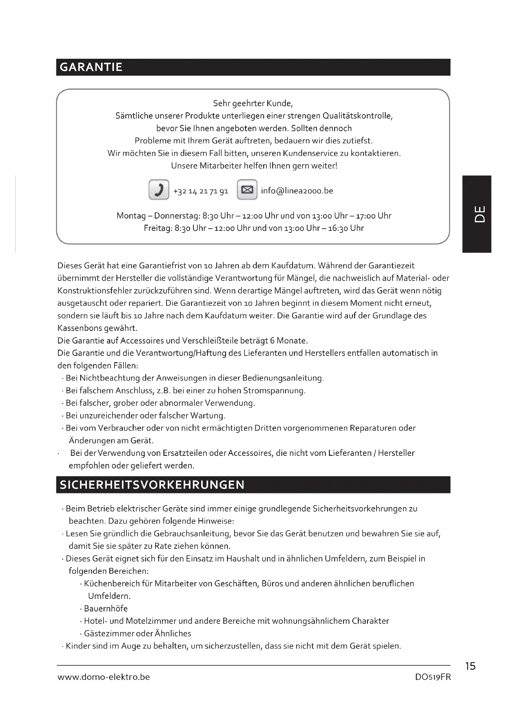 GARANTIE Sehr geehrter Kunde, Sämtliche unserer Produkte unterliegen einer strengen Qualitätskontrolle, bevor Sie Ihnen angeboten werden. Sollten dennoch Probleme mit Ihrem Gerät auftreten, bedauern wir dies zutiefst. Wir möchten Sie in diesem Fall bitten, unseren Kundenservice zu kontaktieren. Unsere Mitarbeiter helfen Ihnen gern weiter! +32 14 21 71 91 info@linea2000.be Montag – Donnerstag: 8:30 Uhr – 12:00 Uhr und von 13:00 Uhr – 17:00 Uhr Freitag: 8:30 Uhr – 12:00 Uhr und von 13:00 Uhr – 16:30 Uhr Dieses Gerät hat eine Garantiefrist von 10 Jahren ab dem Kaufdatum. Während der Garantiezeit übernimmt der Hersteller die vollständige Verantwortung für Mängel, die nachweislich auf Material- oder Konstruktionsfehler zurückzuführen sind. Wenn derartige Mängel auftreten, wird das Gerät wenn nötig ausgetauscht oder repariert. Die Garantiezeit von 10 Jahren beginnt in diesem Moment nicht erneut, sondern sie läuft bis 10 Jahre nach dem Kaufdatum weiter. Die Garantie wird auf der Grundlage des Kassenbons gewährt. Die Garantie auf Accessoires und Verschleißteile beträgt 6 Monate. Die Garantie und die Verantwortung/Haftung des Lieferanten und Herstellers entfallen automatisch in den folgenden Fällen: